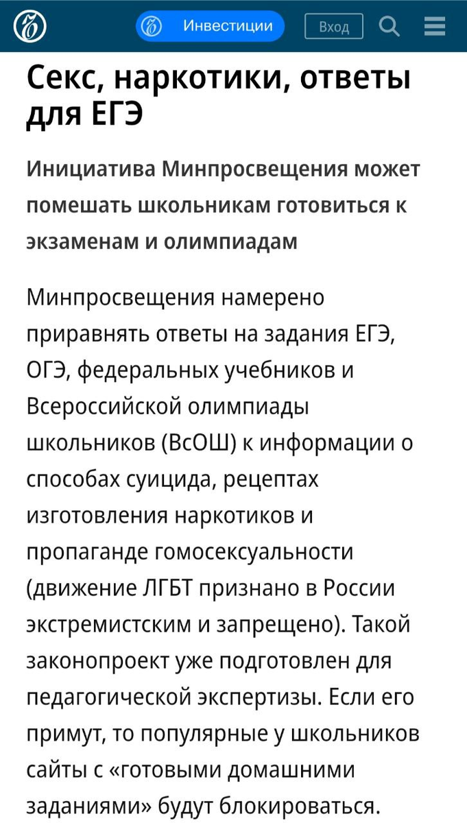 В общем, прочитал инициативу. Ответы на ЕГЭ и ОГЭ приравняют к запрещенке со всеми вытекающими. Хорошо, если с вытекающими блокировками, а не уголовкой Мне понравилась итоговая фраза: Документ уже направили на педагогическую экспертизу Мне кажется, тут должна быть уже психиатрическая экспертиза... Но это не все на сегодня в части запретов. Перенесемся в ГосДуму В Госдуме объяснили, как россиянам следует пользоваться VPN: «Захотел ты зайти в запрещённый Instagram*. Зайди, посмотри, выключи VPN. Захотел посмотреть что-то на YouTube — включил VPN, посмотрел, выключил. Если кому-то нестерпимо хочется позвонить по WhatsApp*, позвоните, но потом выключите. Потому что, если вы живёте с включённым VPN, все усилия государства, потраченные на то, чтобы подросток не столкнулся с группами смерти, террористами, педофилами, сводятся на нет». На вопрос о том, причем тут все вышеназванное, Боярский ответил прямо: «При чём?!! Все такие уверенные, пока не отдадут свои кровные украинским мошенникам, п