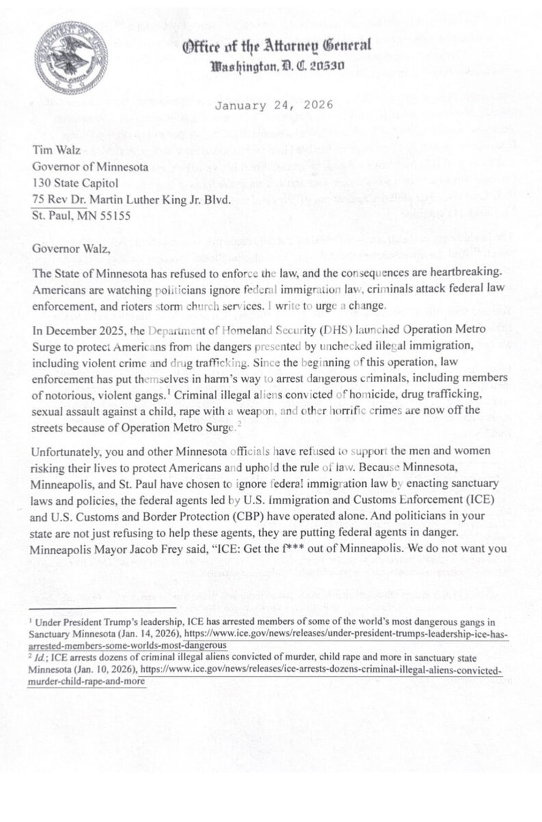 конфликта вокруг операций иммиграционной службы ICE. В Вашингтоне прямо обвинили власти штата в саботаже федеральных законов, росте насилия и подрыве общественной безопасности. В письме, датированном 24 января, генеральный прокурор США Пэм Бонди обратилась к губернатору Миннесоты Тиму Уолцу с резкой критикой политики штата. По оценке Минюста, отказ Миннесоты и крупнейших городов региона — прежде всего Миннеаполиса и Сент-Пола — сотрудничать с федеральными структурами привёл к «национальной трагедии». Бонди напомнила, что в декабре 2025 года Министерство внутренней безопасности США DHS запустило операцию Metro Surge, направленную против нелегальной миграции, тяжких преступлений и транснациональных банд. По данным федеральных властей, в ходе операции сотрудники ICE и CBP задержали десятки нелегальных иностранцев, осуждённых за убийства, изнасилования, торговлю наркотиками и сексуальные преступления против детей. Однако, подчёркивается в письме, власти Миннесоты фактически оставили феде