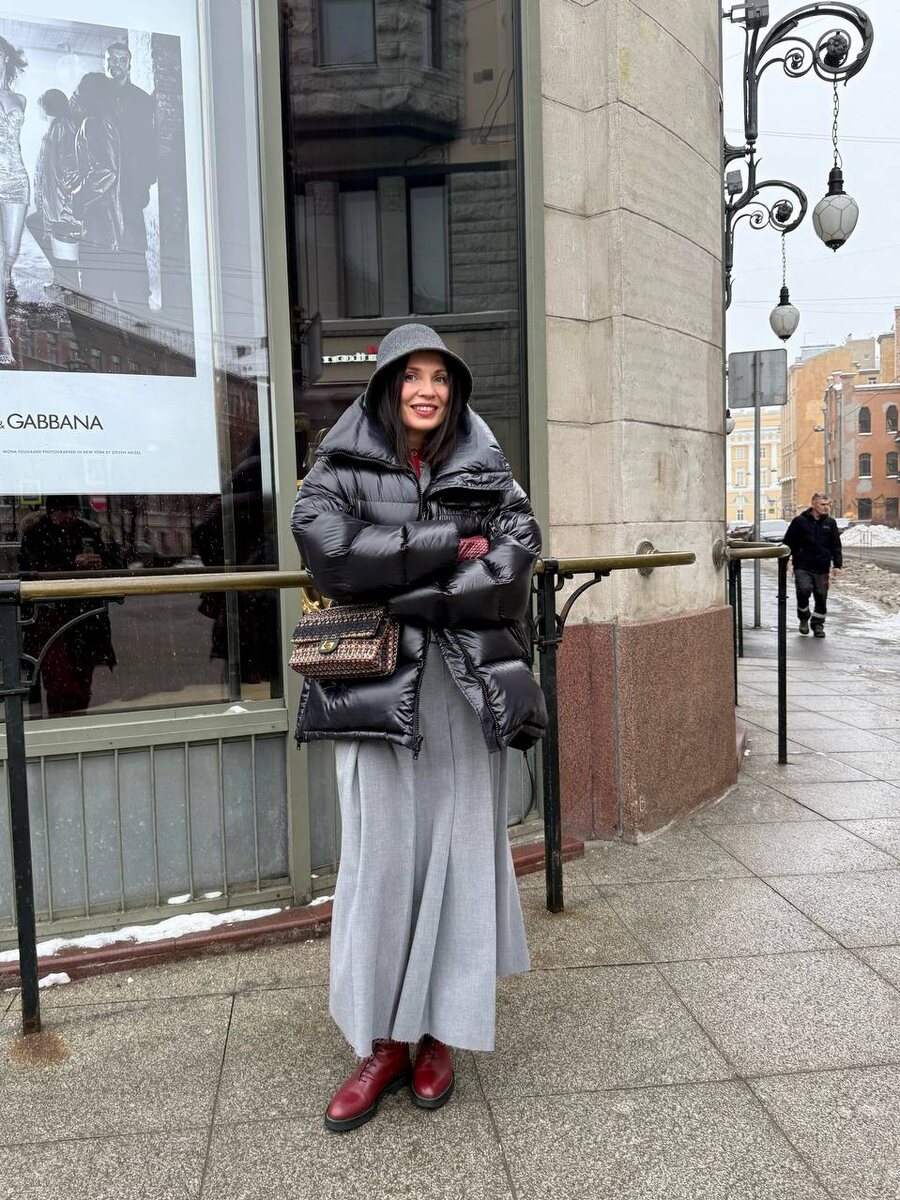Елена Ромашова — одна из самых ярких и стильных блогеров современности. Ее чувство вкуса и умение сочетать тренды с классикой вдохновляют тысячи подписчиков. В этой статье собрала 9 безупречных образов от Елены для вашего вдохновения! Первый образ построен на спокойной базе: серая юбка в складку и серый джемпер, дополненные объемным черным пуховиком. Но вся магия – в деталях! Серая фетровая шапка-панама добавляет изюминку, а ботинки и перчатки бордового оттенка – это именно тот цветовой взрыв, который делает образ живым и выразительным. Практичный и комфортный монохромный ансамбль в серой палитре. Основу составляют серые брюки и водолазка, дополненные черным пуховиком и серыми ботинками. Ярким акцентом служит оливковая сумка-тоут. Голову и руки согревают серая меховая шапка-ушанка и серые перчатки. Пальто макси в глубоком коричневом оттенке задает тон всему ансамблю. Его длина и крой подчеркивают современную элегантность, а изысканный кожаный пояс акцентирует талию, придавая силуэту у