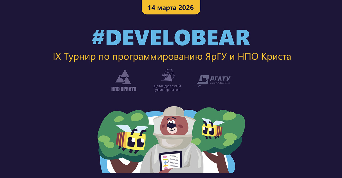 Ежегодный открытый турнир по программированию среди школьников #DEVELOBEAR состоится 14 марта. Организаторами турнира являются НПО «Криста» ЯрГУ имени П. Г. Демидова, партнёром – РГАТУ имени П. А. Соловьева. Если вы учитесь в школе, лицее или гимназии Ярославля, Рыбинска и других городов страны и хотите проверить свои силы в «битве роботов», присоединяйтесь! От каждого учебного заведения в турнире могут играть команды в составе 3-х человек. Мы рады видеть не только новичков, но и участников предыдущих турниров! Увлекательность и призы гарантируем! Победители турнира получат дополнительные баллы к результатам ЕГЭ при поступлении в ЯрГУ имени П. Г. Демидова и РГАТУ имени П. А. Соловьёва. График турнира: Регистрация: с 26 января по 13 февраля на сайте develobear.ru. Отбор (онлайн): со 2 по 26 февраля. Финал (основной турнир): 14 марта. Успейте подать заявки!
