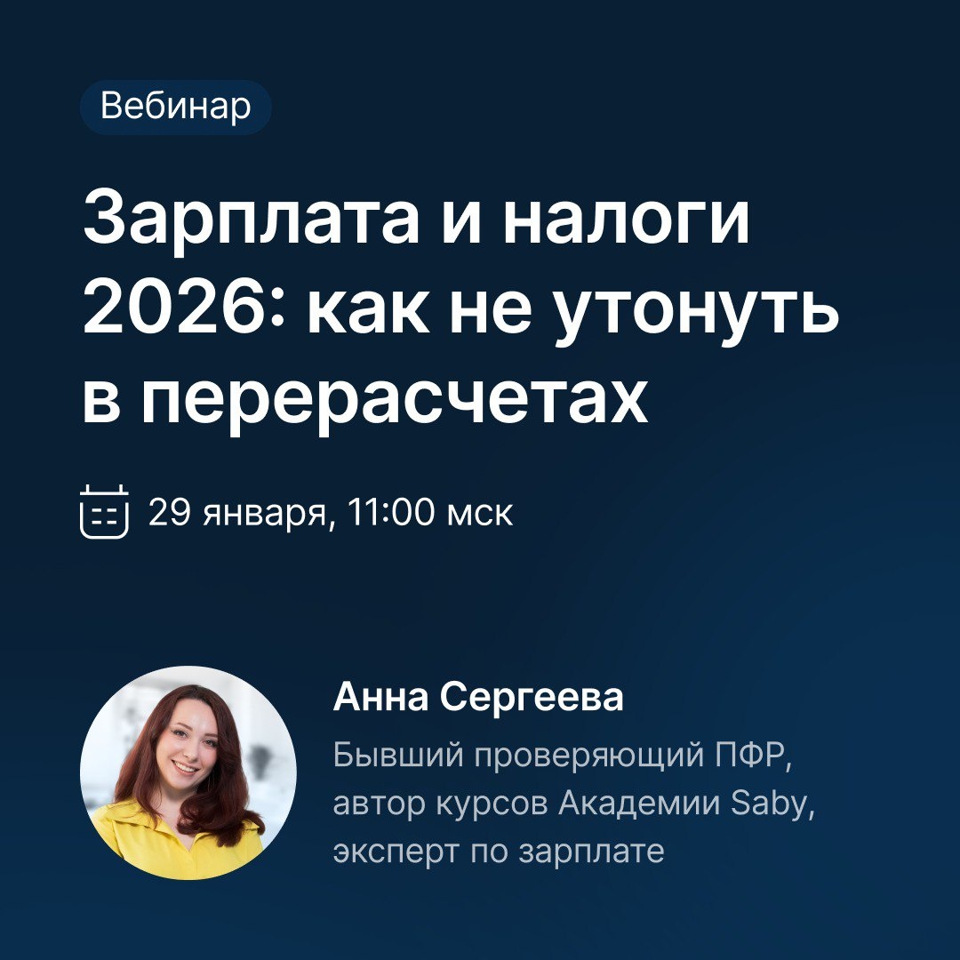 » 2026 год приходит с сомнительными "подарочками" 🎁 — обновленными налогами, взносами и правилами. Ставки поменялись, ФОТ подрос, а платить теперь нужно даже там, где раньше можно было спокойно «ничего не начислять». Не учли новый МРОТ или базу — ждите письмо «счастья» от ФНС. И всё это — в самый загруженный период. Хорошая новость: 💙 Saby поможет избежать ошибок. 29 января в 11:00 (Мск) приглашаем на практический вебинар, на котором подробно раскроем темы: ⏺ Страховые взносы и предельная база: отмена льгот для МСП, рост нагрузки для IT и другие изменения. ⏺ Директор без зарплаты: когда взносы все равно придется платить и как Saby это автоматически учитывает. ⏺ Зарплата и налоги с ФОТ при АУСН: считаем по новым правилам. ⏺ Авансовые уведомления по зарплатным налогам: заполняем и отправляем в одном окне, без переключений между формами. ⏺ Ежегодный рост МРОТ: на что влияют новые значения и как Saby контролирует расчет отпускных, больничных и других начислений. 👤Спикер: Анна Сер