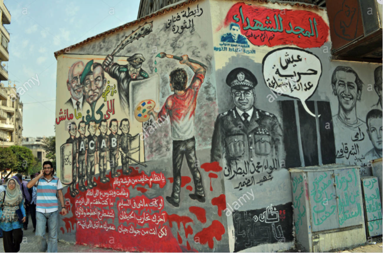 Также именно с 2011 года в Египте наступает расцвет уличного искусства в крупных городах. Особенно это касается Каира, но также Александрии и других городов, охваченных водоворотом этих событий. Изображения данного жанра объединяют темы из прошлого и настоящего в жизни Египта, они словно преодолевают пространство и время, в то же самое время, отразив события, происходившие на политической арене страны. Причём за последние три года увлечение граффити теряет свою прежнюю силу в Каире, в то время, как в Александрии, с ее сильным местным колоритом, напротив, произведения уличных художников становятся все более заметны во всех общественных местах города.