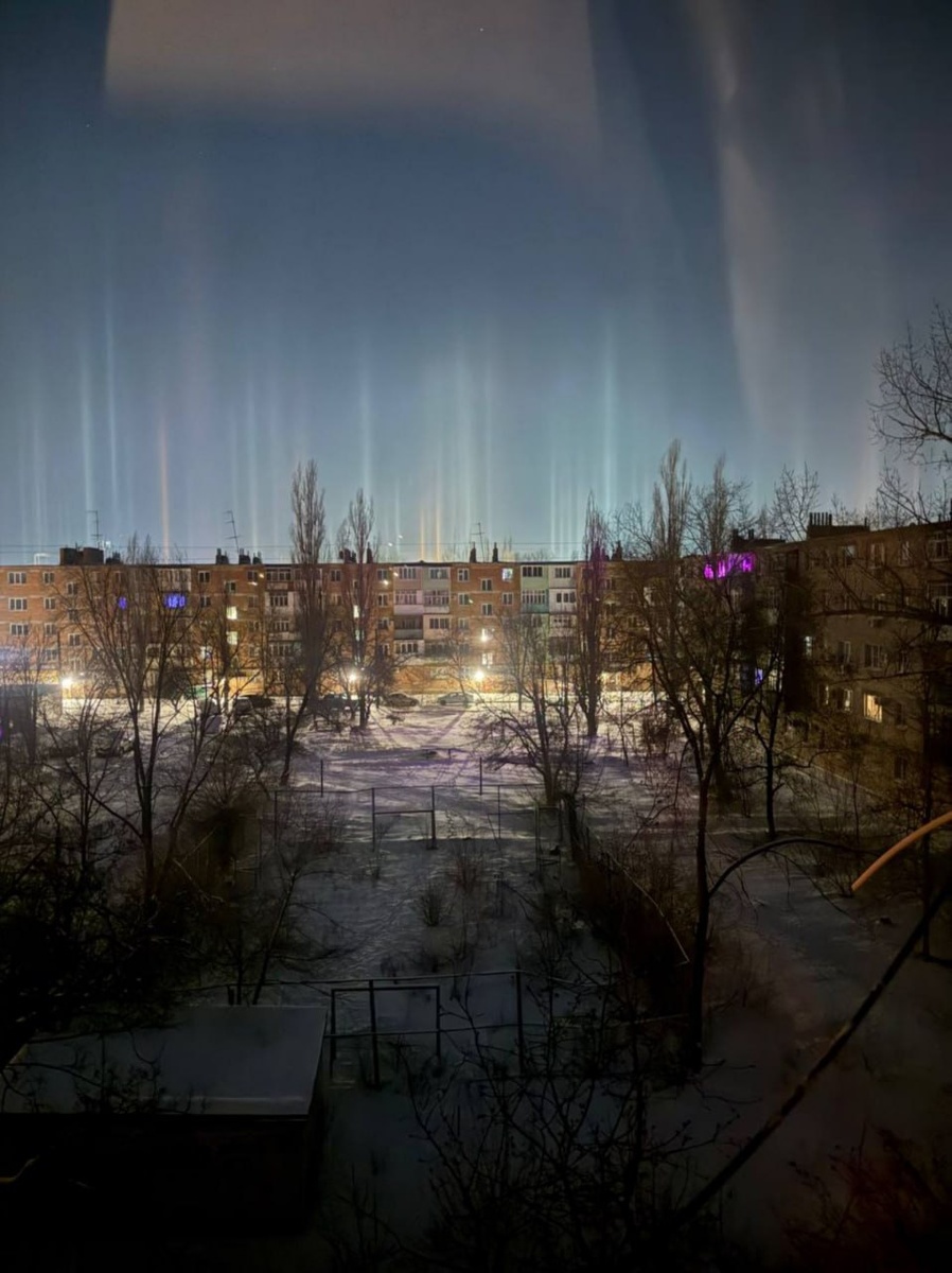 Прошлой ночью в Каменске были красивые световые столбы. Эффект скорее всего из-за мороза...