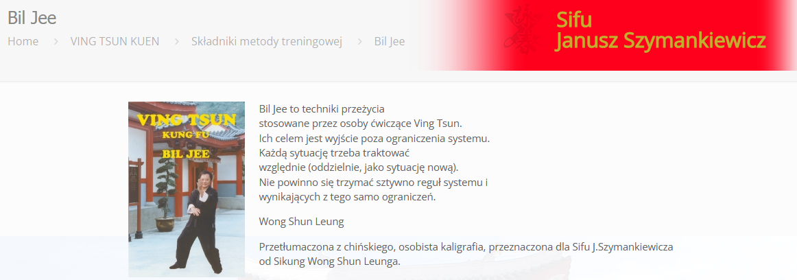Вонг Шун Леунг Переведено с китайского, личная каллиграфия, предназначенная для Сифу Я. Шиманкевича от Сигуна Вонг Шун Леунга. Следующим этапом в развитии, познании и понимании техники Винг Чун является овладение формой Бил Джи (Bil Jee), чье название означает «пронзающие пальцы». В школе мастера Вонг Шун Лёна у нее есть другие, неформальные названия: «как сбежать» или «как выжить». Многие учителя этой системы фетишизируют эту форму, приписывая ей содержание неких особых, «смертельных» техник для избранных. Однако правда совершенно иная. Форму Бил Джи действительно преподают «избранным», то есть самым продвинутым ученика