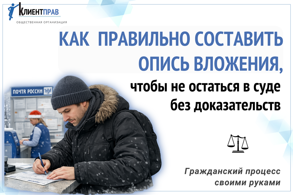Отправляете документы в суд? Не забудьте про опись вложения Многие считают, что достаточно просто отправить иск или претензию заказным письмом. А потом удивляются: суд пишет, что доказательств направления документов нет 🤷♀️ Разбираемся коротко и по делу. Это документ (форма 107 Почты России), где перечислены все бумаги, которые вы отправляете: иск, договор, чеки, претензия и т.д. Опись заверяется сотрудником почты и штампом отделения. Зачем она нужна Опись подтверждает сразу несколько важных вещей: — что документы действительно отправлены; — какие именно документы были отправлены; — дату отправки (вместе с квитанцией); — соблюдение процессуальных требований. Без описи сложно доказать, что вы направили, например, копию иска со всеми приложениями, а не просто «какие-то бумаги». Требует ли закон опись? Прямого требования нет. Но на практике суды ориентируются именно на неё, особенно когда: — проверяют, направляли ли вы копии иска другим участникам процесса; — оценивают соблюдение досу