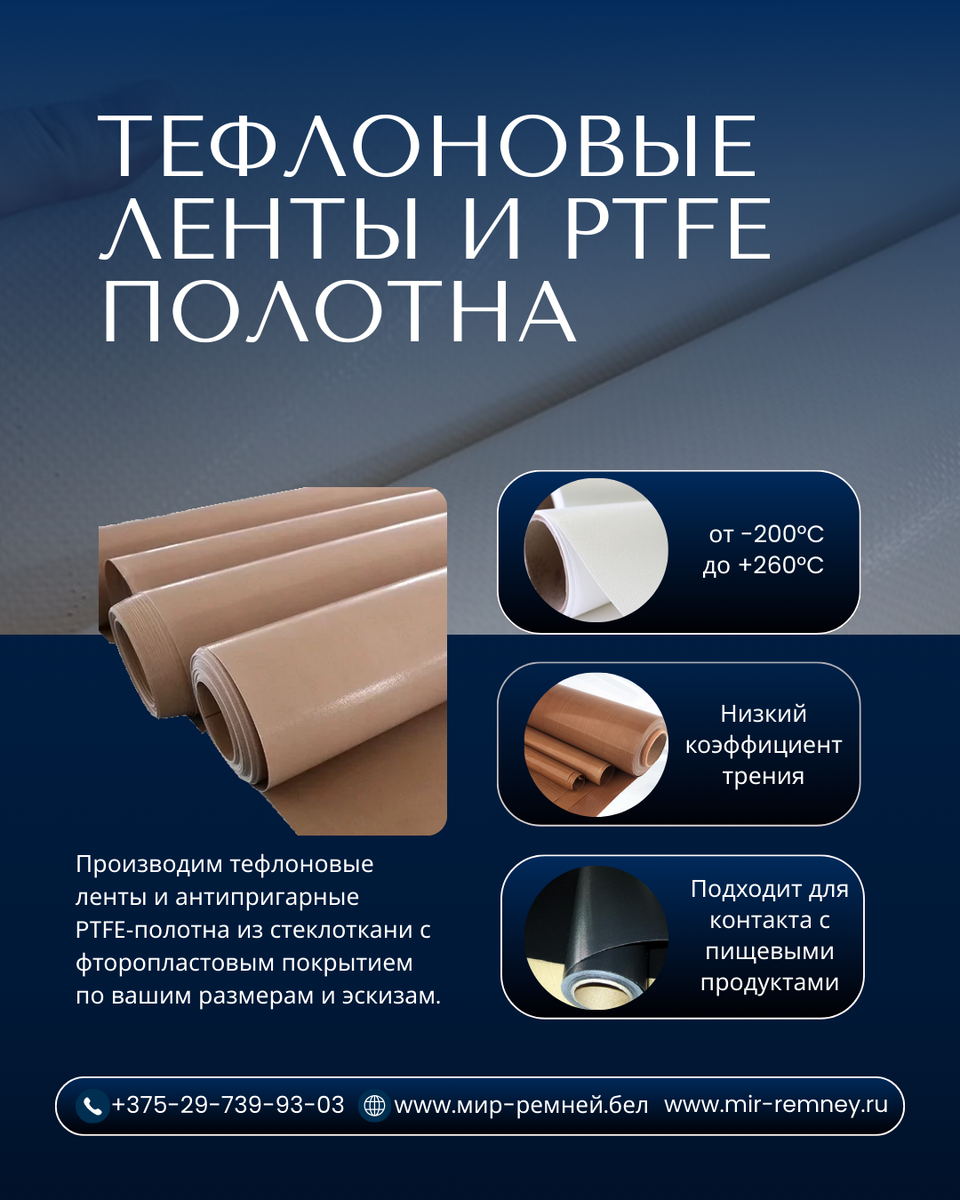 На термопрессах, запайщиках пакетов, вакуумных формовщиках, сушильных камерах и конвейерах пищевого/химического производства одна проблема встречается постоянно: материал прилипает к горячим поверхностям, нагар накапливается, швы получаются кривыми, очистка занимает часы, а брак растёт. Обычные силиконовые коврики или фольга быстро изнашиваются, плавятся или оставляют следы. Решение, которое радикально меняет ситуацию: тефлоновые (PTFE) ленты и полотна из стеклоткани с фторопластовым покрытием — на заказ, точно под ваши размеры и задачу. Мы в «Мир ремней» производим их сами в Минске: от рулона до готового вкладыша, прокладки или ленты по вашему чертежу. Без посредников — цены ниже, сроки от 1 дня. Что делает PTFE-полотно настоящим спасением 🔹 Экстремальная термостойкость: от -200°C до +260°C постоянно, кратковременно до +300°C — не плавится, не деформируется даже в самых горячих процессах.