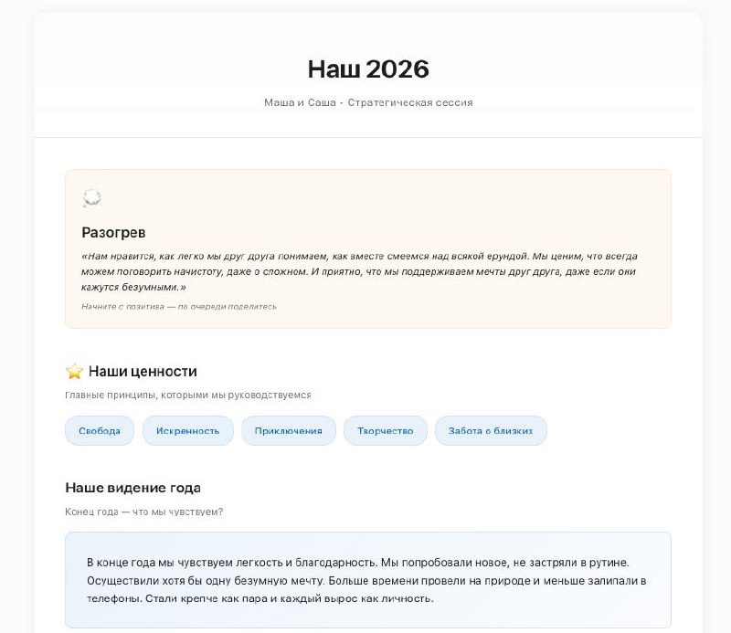! Я пока не делал Личное планирование, но мы в этом году попробовали с Наташей совместное партнерское и это топ! Рассказываю как делал: 1. Поговорил про это с Claude, попросил составить план такой страт.сессии на 1-2 часа 2. Оформил это в виде HTML-странички которую мы бы могли заполнить + пример заполненный 3. Сделали вместе с Наташей за 1.5 часа и было супер круто! Выглядит и содержит это примерно такие блоки: • разогрев, что нам нравится в наших отношениях • наши ценности • видение года - как хотим себя чувствовать в конце 2026? • далее планирование по сферам жизни: отношения, путешествяи, дом и быт, здоровье, финансы, развитие, соц.жизнь, личное пространство • затем блок “что улучшаем”, честный разговор о зонах роста • ключевые вехи года по кварталам • главные цели на год (3-5 • как будем отслеживать - мы договорились раз в месяц сверяться. И все! Что было ценно в ходе заполнения: Я заметил что мне было важно увидеть, что надо уже сейчас что-то делать для того, чтобы это случил