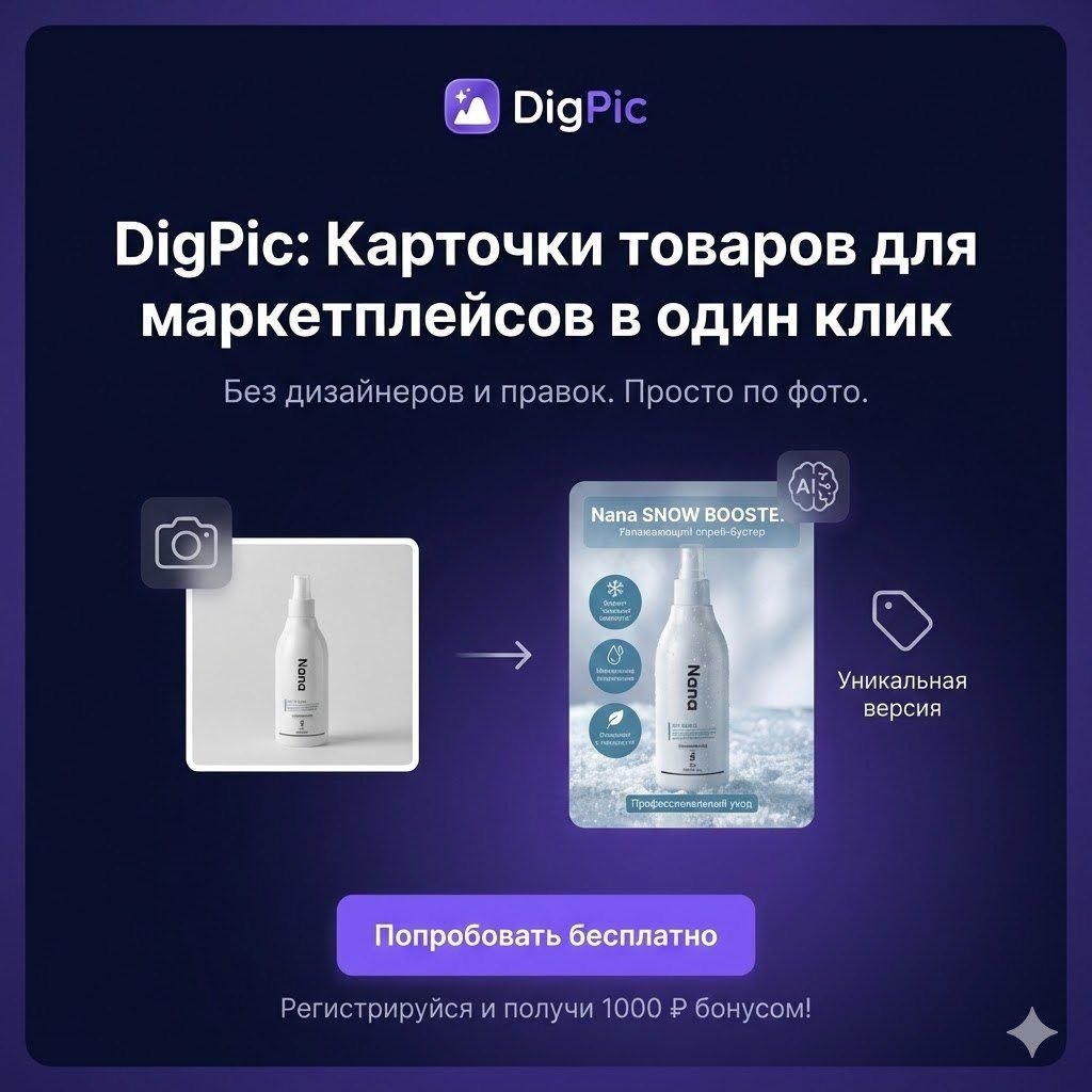 Если вы продаёте на WB / Ozon / Ya.Market и устали от: — дизайнеров и фотографов — бесконечных правок фотографий и пересъемок — сложных AI-сервисов, где нужно «разбираться» и писать промты DigPic упаковывает карточку товара за пару минут: фото, фон, инфографика — все это в один клик. Что вы получаете: ⚡️ готовые изображения для карточки за пару минут 🧠 автопромты от нейросети: идеи, композиции и тексты для инфографики (ничего придумывать не нужно) 🏷 генерация по фотореференсам конкурентов — делаете свою уникальную карточку 📸 единый продающий стиль на всех изображениях — выглядит цельно и профессионально 📈 рост CTR до 7 раз по нашим A/B-тестам после обновления главного фото 👉 Важно: При регистрации мы начисляем 1000 ₽ бонусом — этого хватает, чтобы спокойно протестировать сервис и создать первые карточки без вложений. DigPic — это другое решение на рынке: не еще один сложный AI-редактор, а инструмент, который сам ведёт вас к результату. Попробуйте прямо сейчас и создайте