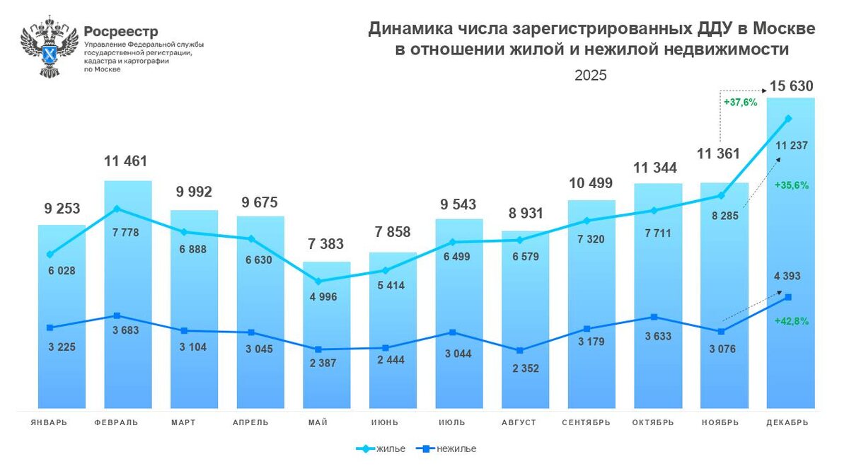 Π Π΄Π΅ΠΊΠ°Π±ΡΠ΅ 2025 Π³ΠΎΠ΄Π° Π² ΠΠΎΡΠΊΠ²Π΅ Π·Π°ΡΠ΅Π³ΠΈΡΡΡΠΈΡΠΎΠ²Π°Π½ΠΎ 15Β 630 Π΄ΠΎΠ³ΠΎΠ²ΠΎΡΠΎΠ² ΡΡΠ°ΡΡΠΈΡ Π² Π΄ΠΎΠ»Π΅Π²ΠΎΠΌ ΡΡΡΠΎΠΈΡΠ΅Π»ΡΡΡΠ²Π΅ Π² ΠΎΡΠ½ΠΎΡΠ΅Π½ΠΈΠΈ ΠΆΠΈΠ»ΠΎΠΉ ΠΈ Π½Π΅ΠΆΠΈΠ»ΠΎΠΉ Π½Π΅Π΄Π²ΠΈΠΆΠΈΠΌΠΎΡΡΠΈ. ΠΡΠΎ ΠΌΠ°ΠΊΡΠΈΠΌΠ°Π»ΡΠ½ΡΠΉ ΠΌΠ΅ΡΡΡΠ½ΡΠΉ ΡΠ΅Π·ΡΠ»ΡΡΠ°Ρ ΠΏΡΠΎΡΠ»ΠΎΠ³ΠΎ Π³ΠΎΠ΄Π°, ΡΠ°ΡΡΠΊΠ°Π·Π°Π» ΡΡΠΊΠΎΠ²ΠΎΠ΄ΠΈΡΠ΅Π»Ρ Π£ΠΏΡΠ°Π²Π»Π΅Π½ΠΈΡ Π ΠΎΡΡΠ΅Π΅ΡΡΡΠ° ΠΏΠΎ ΠΠΎΡΠΊΠ²Π΅ ΠΠ³ΠΎΡΡ ΠΠ°ΠΉΠ΄Π°Π½ΠΎΠ². ΠΡΠ΅Π³ΠΎ Π² Π΄Π΅ΠΊΠ°Π±ΡΠ΅ Π±ΡΠ»ΠΎ ΠΎΡΠΎΡΠΌΠ»Π΅Π½ΠΎ Π½Π° 37,6% ΠΠΠ£ Π±ΠΎΠ»ΡΡΠ΅, ΡΠ΅ΠΌ ΠΌΠ΅ΡΡΡΠ΅ΠΌ ΡΠ°Π½Π΅Π΅ (11Β 361Β ΠΠΠ£). Π ΠΆΠΈΠ»ΠΎΠΌ ΡΠ΅Π³ΠΌΠ΅Π½ΡΠ΅ (11 237 ΠΠΠ£) ΡΠΈΡΠ»ΠΎ Π΄ΠΎΠ³ΠΎΠ²ΠΎΡΠΎΠ² ΡΡΠ°ΡΡΠΈΡ Π² Π΄ΠΎΠ»Π΅Π²ΠΎΠΌ ΡΡΡΠΎΠΈΡΠ΅Π»ΡΡΡΠ²Π΅ ΡΠ²Π΅Π»ΠΈΡΠΈΠ»ΠΎΡΡ ΠΊ Π½ΠΎΡΠ±ΡΡ Π½Π° 35,6%, Π° Π² Π½Π΅ΠΆΠΈΠ»ΠΎΠΌ (4 393 ΠΠΠ£) ΡΠΎΡΡ ΡΠΎΡΡΠ°Π²ΠΈΠ» 42,8%. Β«ΠΠ΅ΠΊΠ°Π±ΡΡΡΠΊΠ°Ρ Π°ΠΊΡΠΈΠ²Π½ΠΎΡΡΡ Π½Π° ΠΏΠ΅ΡΠ²ΠΈΡΠ½ΠΎΠΌ ΡΡΠ½ΠΊΠ΅ ΠΠΎΡΠΊΠ²Ρ ΡΠ²Π»ΡΠ΅ΡΡΡ Π΅ΠΆΠ΅Π³ΠΎΠ΄Π½ΡΠΌ ΡΡΠ΅Π½Π΄ΠΎΠΌ. Π’Π°ΠΊ, Π½Π° ΠΏΡΠΎΡΡΠΆΠ΅Π½ΠΈΠΈ ΠΏΠΎΡΠ»Π΅Π΄Π½ΠΈΡ