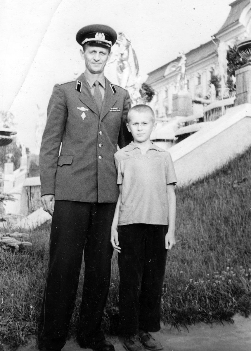 Офицер танковых войск в открытом кителе с академическим знаком и танковой классностью образца 1958 года на фоне Большого каскада в
