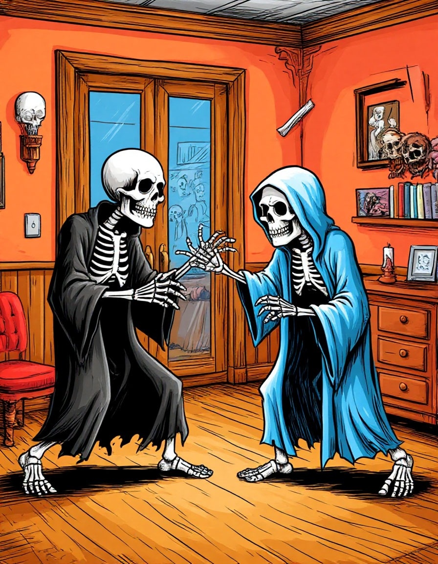 А затем морок исчез. Напротив друг друга стояли две фигуры в чёрных балахонах и с косами в руках. Из-под капюшонов приветственно оскалились улыбками друг на друга два черепа.