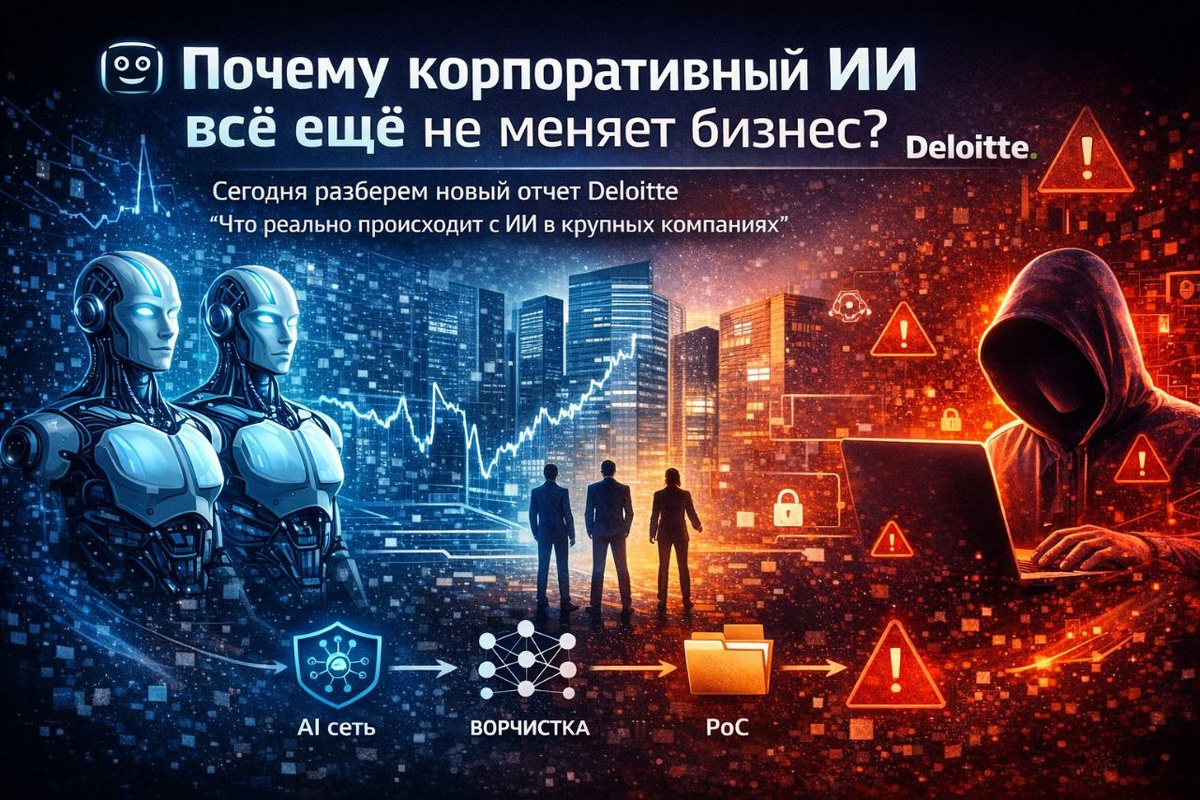 ? Сегодня разберем новый отчет Deloitte "Что реально происходит с ИИ в крупных компаниях" ИИ уже стал нормой. По данным Deloitte, около 60% сотрудников крупных компаний имеют доступ к одобренным ИИ-инструментам. Но остается проблема: ИИ есть, но он не встроен в повседневную работу. В большинстве случаев он используется как вспомогательный инструмент: для поиска информации, подготовки отчётов и ускорения отдельных задач. Сквозные процессы при этом почти не меняются. ⚙️ От пилотов к продакшену Только 25 % компаний смогли перевести ИИ-инициативы из экспериментов в промышленную эксплуатацию. Остальные застряли на стадии пилотов и PoC. Причина не в технологиях, а в сложности: ➖интеграция ИИ в бизнес-процессы, ➖пересмотр архитектуры, ➖требования безопасности и соответствия, ➖отсутствие понятных моделей управления. ИИ внедряется быстрее, чем компании успевают перестроить операционную модель. 🔐 ИИ расширяет поверхность атаки С ростом корпоративного ИИ появляются новые риски. ИИ-агенты