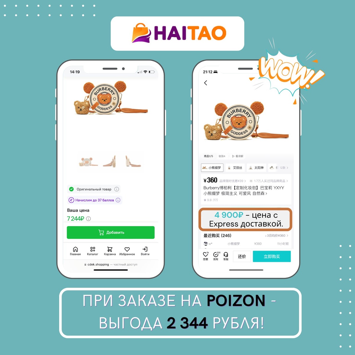 Косметичка Burberry Goddess 🧸📦 в обоих случаях — товар с оригинального сайта Poizon. Но разница в цене говорит сама за себя 👇 — через известную транспортную: 7 244 ₽ — через HaiTao (выкуп с того же Poizon): 4 900 ₽ с Express-доставкой 😳 Экономия — 2 344 ₽. Один бренд. Один сайт. Но совсем разный итог в чеке. Burberry — да. Переплата — нет 😉 Напишите нам — рассчитаем вашу выгоду с HaiTao 🧡 #закажисhaitao #burberry #логистикаКитай