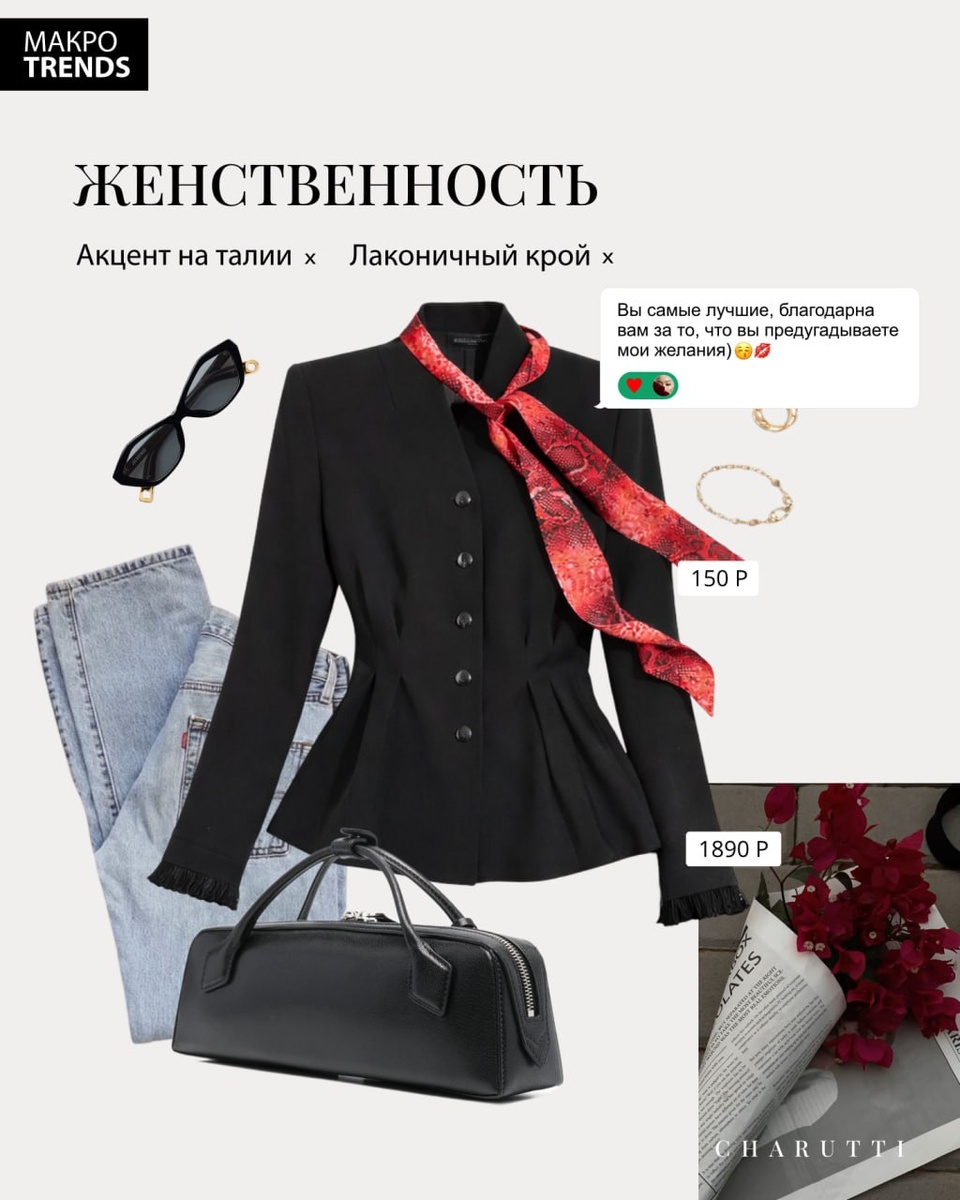 Жакет ЧАРУТТИ с приталенным силуэтом формирует фигуру, а декор на рукавах акцентирует женственность. 🐋Жакет приталенного силуэта🐋 Размеры: 44-54 🟡1890 Р ПОДОБРАТЬ РАЗМЕР 🐋🐋🐋🐋🐋🐋🐋 Лента из дубайского шелка: гладкая, струящаяся, с выразительным принтом. Легко драпируется и эффектно работает как акцент на сумке, шее или талии. 🐋Лента твилли (опасно прекрасная)🐋 Размеры: one size 🟡150 Р КУПИТЬ 🐋🐋🐋
