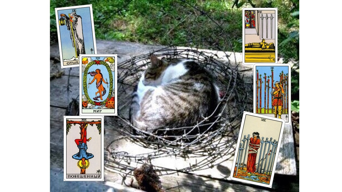 Здравствуйте! В комментариях-ответах к фотографии спящего кота сразу несколько человек написали, что это 4 мечей. Да, кот здесь находится в состоянии покоя и сна, но я думаю, что по 4 мечей он нашел бы для отдыха более укромное место, куда никому не будет доступа, где его не потревожат внешние раздражители. Первая мысль, которая у меня возникла при виде на животное, свернувшееся клубочком в центре мотка из колючей проволоки - он от кого-то защищается, прячется! Не хочет, чтобы его трогали, брали на руки, поэтому и выбрал для сна такое неподходящее ложе. В этом есть что-то от энергии 9-го аркана: так может это Отшельник или 9 жезлов? Но в 9 жезлов сильно проявлена тема напряженной бдительности и постоянной готовности к тому, чтобы дать отпор. Тут уж точно не расслабишься и не уснешь. Ну а Отшельник, также как и 4 мечей, выбрал бы более уединенное место. Потом я подумала: а что если это 8 мечей? Окружающие кота колючки хорошо соотносятся с ловушкой из острых мечей, в которой оказывается