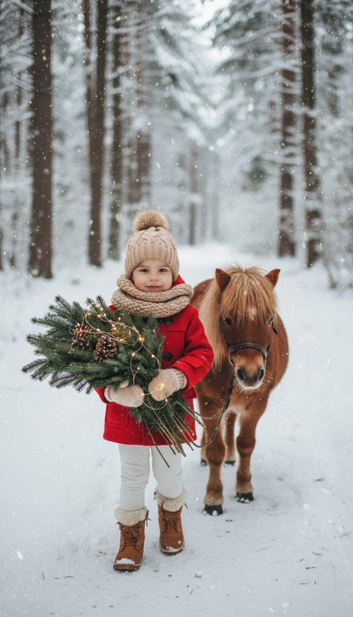 : 😀Заходим в этот бот или в этот 😀Выбираем "нейросети" 😀Нажимаем "Nano Banana" 😀Нажимаем "Nano Banana Pro" 😀Прикрепляем через скрепку свое фото и выбранный промпт 😀Наслаждаемся результатом😍 Сохрани черты лица ребенка с фото. Экстремальный крупный план в стиле raw с добавлением зернистости, запечатлевающий мальчика 3 лет в лесу. Ребенок одет в красное пальто-фонарик, белые колготки, высокие ботинки с меховушкой по верху, бежевые шарф снежок и шапка с помпоном меховым, и бежевые варежки В руках он держит большой еловый букет, с шишками и гирляндой с теплым светом. А рядом с ним идет маленькая лошадка-пони, она коричневая с ухоженной гривой Лёгкий снег падает вокруг, создавая атмосферу зимней сказки. Они идут по тропинке вокруг густой лес, деревья покрыты снегом, создавая уединённую и тёплую атмосферу, несмотря на зимнюю стужу.Мягкий свет, пробивающийся через ветви, освещает лицо, добавляя сцене волшебства и лёгкости. Зернистость фотографии усиливает ощущение уюта и праздника #дет