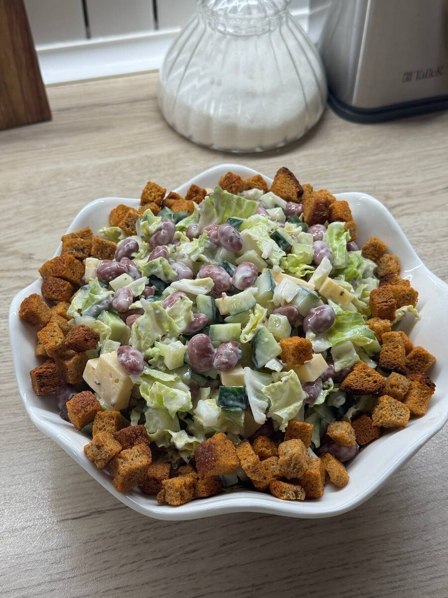Ингредиенты: ▫️1 средний огурец ▫️1 баночка консервированной фасоли (красной или белой) ▫️100-150 г сыра (Российский, сливочный, фета или брынза) ▫️2 ст. л греческого йогурта (или сметаны) ▫️0,5 ч. л прованских трав ▫️0,5 ч. л сушёного чеснока (или 2 зубчика свежего, пропустить через пресс) ▫️0,5 ч. л семян чиа ▫️1 ч. л лимонного сока ▫️Зелень или пекинская капуста по вкусу ▫️Сухарики или гренки для подачи Приготовление: Огурец нарезать небольшим кубиком. Сыр также нарезать кубиком среднего размера. В салатник поместить нарезанную зелень или измельчённую пекинскую капусту. Добавить сыр, огурец и красную фасоль (предварительно слив жидкость и промыв, если она в томатном соусе). Приготовить заправку: в небольшую миску добавить греческий йогурт, прованские травы, чеснок, семена чиа и лимонный сок. Тщательно перемешать до однородности. Заправить салат приготовленным соусом и аккуратно перемешать. Перед подачей посыпать салат домашними гренками или готовыми сухариками, чтобы они остались хр
