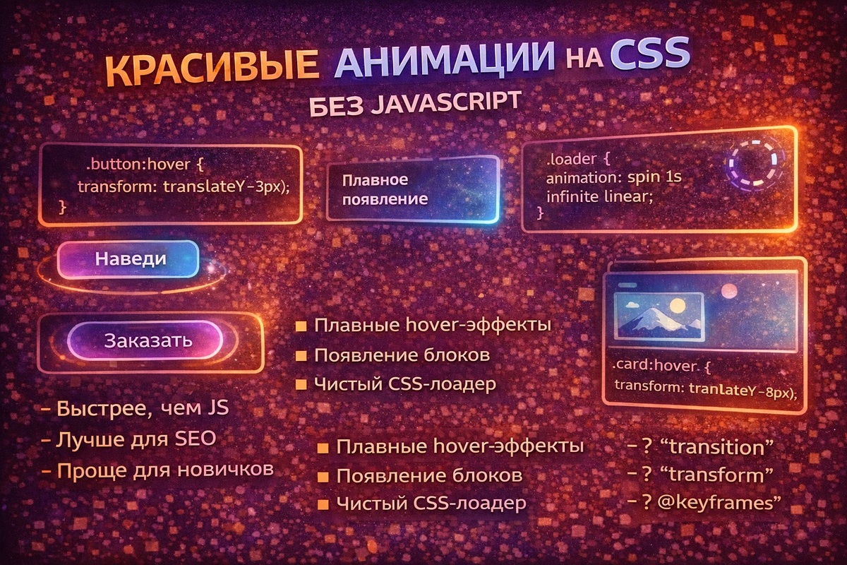 На самом деле CSS умеет очень многое: Большая часть UI-анимаций делается именно на CSS. В этой статье разберём: Начнём с самого простого, но очень важного. Это must-have для любого сайта. Очень популярный эффект — когда элементы плавно появляются. 💡 Часто используется без JS, просто при загрузке страницы. Иногда нужно привлечь внимание пользователя. ⚠️ Важно: не злоупотреблять, иначе будет раздражать. Даже загрузчики можно сделать полностью на CSS. Очень популярный приём в современных интерфейсах. CSS отлично подходит и для текста. В остальных случаях CSS — лучший выбор. Если вы только начинаете: CSS-анимации: В следующей статье мы пойдём ещё глубже и разберём скрытые возможности CSS, о которых мало кто знает и которые реально используют в продакшене.