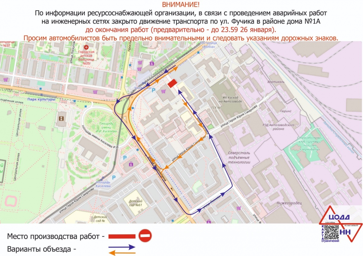 Участок дороги у дома №1 по улице Фучика в Нижнем Новгороде временно закрыли для транспорта. Об этом сообщили в ЦОДД. Ограничения связаны с проведением аварийных работ на инженерных сетях. Их предполагается закончить до конца дня 26 января. Объехать перекрытый участок можно по прилегающим улицам. Нижегородцев просят заранее ознакомиться со схемой движения, быть очень внимательными и следовать указаниям дорожных знаков. Ранее сообщалось, что переулок в Нижнем Новгороде перекрыли до конца апреля. Самые интересные и срочные новости читайте в Telegram-канале «В городе N»