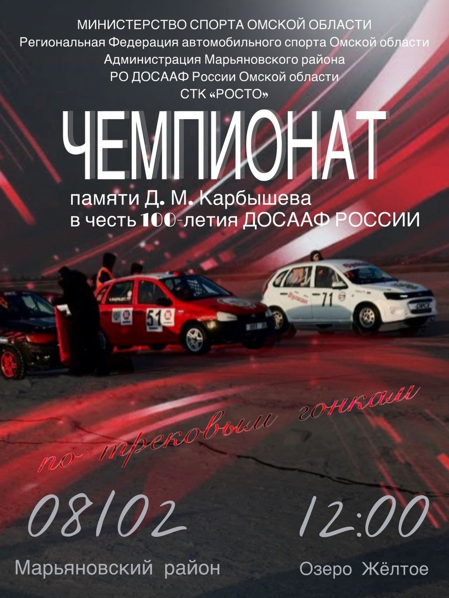 ! 🏁 🏎 💨 Приглашаем на Чемпионат Омской области по трековым гонкам памяти Д. М. Карбышева и в честь 100-летия ДОСААФ России, которое состоится 8⃣февраля в 1⃣2⃣:0⃣0⃣ на озере Жёлтом! Зимние автомобильные гонки – драйв, скорость, адреналин и борьба лучших спортсменов Сибири и Урала! Новосибирск, Новокузнецк, Красноярск, Курган, Омск – лишь некоторые регионы из заявленных! В программе: 🔥заезды юных пилотов на багги – всегда зрелищно, волнительно, они никого не оставляют равнодушными 🔥заезды опытных спортсменов –достойное соперничество сильнейших, мастерство, скорость, адреналин и особая сибирская атмосфера автогонок 🔥тепло и любовь болельщиков – для зрителей приготовлена особая программа: тест-драйв на автомобилях, квадроциклах, дрифт-такси, праздничная лотерея от наших партнёров В торжественной части юнармейцы Марьяновского района вместе со всеми присутствующими почтят память нашего земляка, генерала Дмитрия Михайловича Карбышева.