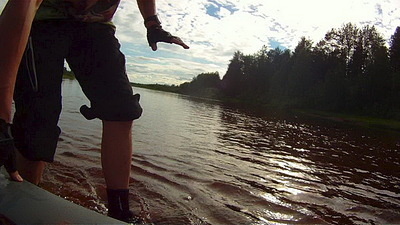 Ближе к устью Весляна разливается, появляются обширные песчаные мели, пляжи. Течение невелико, но присутствует и по спокойной воде и слабом попутном ветре держу около 6-7 км/ч. На одну из мелей сажусь основательно. Боком, с раскачкой, с шестом пройти не выходит, приходится вылезать и проходить мелкое место пешком. Неопреновые носки набирают воду секунды за три, топать по дну в холодной воде в них комфортно, однако сохнут они потом днями. По берегам стоит несколько деревень. Жилая одна, остальные, насколько можно рассмотреть с воды, заброшены, но дороги к ним есть, это я видел, когда проходил велосипедную часть маршрута. Место впадения Весляны в Каму, судя по навигатору, совсем близко. Ближе к 22 часам пытаюсь высмотреть место для стоянки, но ничего подходящего не встречается. После 10 вечера вхожу в Каму, справа бугор, слева мель, нам налево. Солнце скрывается за деревьями по левому борту, становится прохладно. Постепенно выясняется, что мест, сколько-нибудь пригодных для стоянки прост
