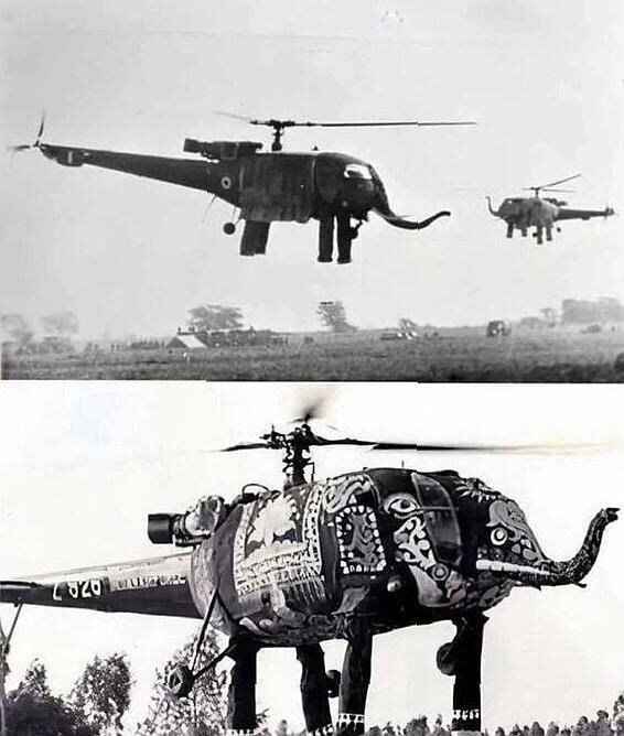 1970 год. Парад. Вертолеты ВВС Индии в костюмах. Не шутка, реально сшитые чехлы-костюмы, превращающие технику почти в живых существ. Над ними работали около 3х недель: яркая ткань закрывала вертолеты почти полностью, оставляя только хвост. За штурвалами были самые опытные пилоты — чтобы «ноги» и «хобот» остались частью идеи, а не оторвались или накрутились на винты 😆