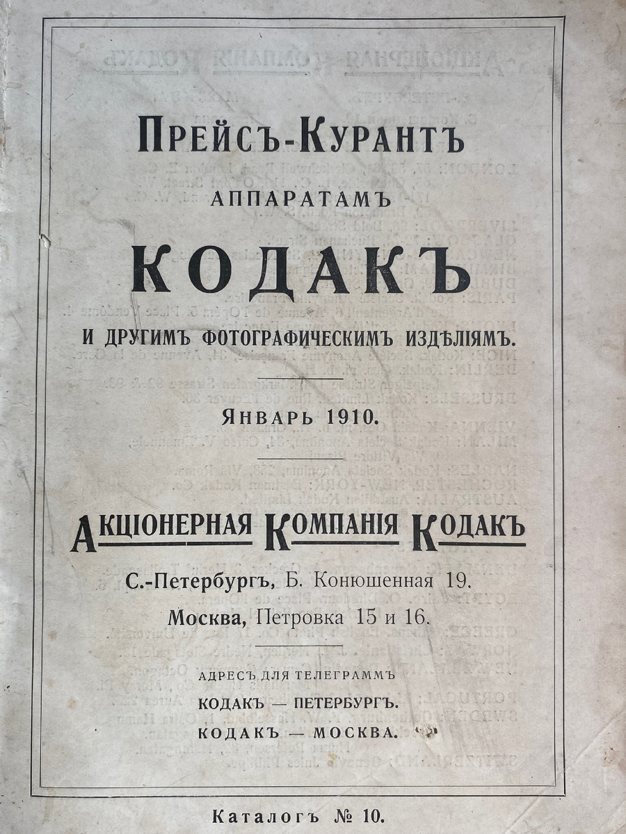 Каталог фототоваров Кодак для Российской империи. Это титульный лист. Передняя часть обложки не сохранилась. Зато на задней части есть интересный момент. Карточка фотографического магазина в городе Орёл. Начинается