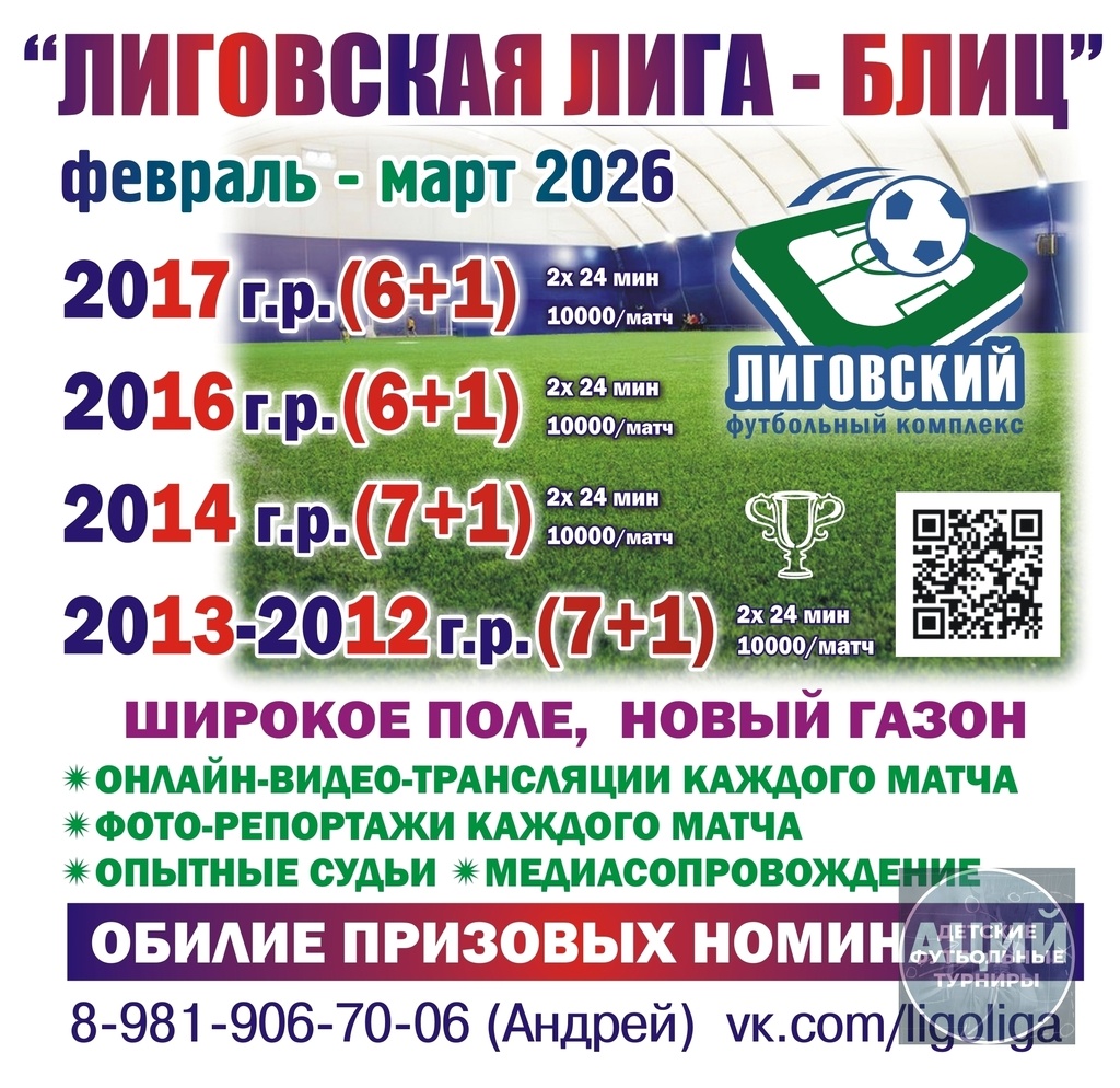 ⛳ ❗Идет прием заявок на участие! ✅ 2017 г.р. ✅ 2016 г.р. ✅ 2014 г.р. ✅ 2013 - 2012 г.р. (при необходимости можно начать участие позднее/раньше или сыграть по более интенсивному графику и закончить досрочно) Матчи по субботам! ⏱ 2 тайма по 24 минуты ⚽ 7х7 (6+1) - 2017 г.р. - без офсайдов ⚽ 8х8 (6+1) - 2016 г.р. - с вне игры (от линии штрафной) ⚽ 8х8 (7+1) - 2014 г.р. - с вне игры ⚽ 8х8 (7+1) - 2013-2012 г.р. - с вне игры Количество матчей зависит от числа участников в конкретной возрастной категории и итоговой турнирной сетки. "Лиговская лига" - это отличный вариант подготовки к игровому сезону 2026, возможность получить игровую практику в комфортном ⛅ Лиговском манеже , играя на газоне в удобный день, в удобное время. ===================== ⛳ Размер удобного широкого поля = 57х36 м 💥 НОВЫЙ искусственный газон 💥 Ворота 5х2 м ===================== 1 игра = 1 час = 2 тайма по 24 минуты + разминка + перерыв Матчи проводятся по субботам и воскресеньям, с учетом пожеланий тренера ☝ УДОБ