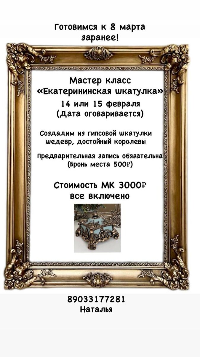 14 или 15 февраля приглашаю на мастер-класс в свою мастерскую на Поддубного, 9. Будем красиво красить гипсовые шкатулки! Также есть подсвечники! Готовимся к 8 марта заранее! Цена почти символическая 3000₽. Все включено! Дети от 13 лет также могут принять участие! Предварительная запись и бронь места 500₽ по телефону 89033177281 Начало в 11.00 Время работы 4-5 часов С собой взять фен и можно сменку