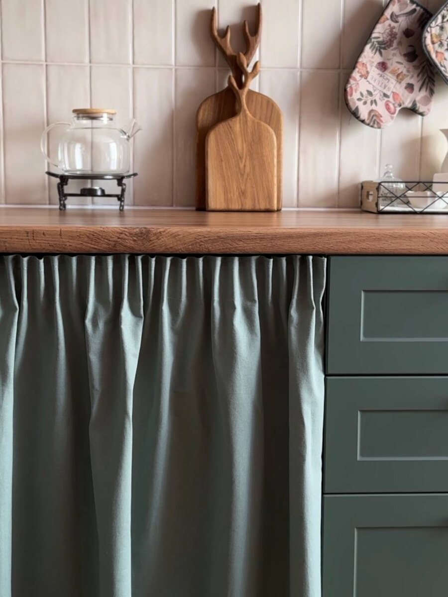 Например, стиральную машину необходимо установить на кухне, и хочется, чтобы она не нарушала общую эстетику. Можно, конечно, сделать встраиваемый фасад. Но у этого решения есть существенные минусы: ➖ машинка не встраивается полностью, приходится оставлять зазор между шкафами ➖ стандартный фасад не подойдет, нужно заказывать индивидуальный ➖ при необходимости машинку не так просто отодвинуть, да и цоколь внизу мешает ➖ а ещё закрытая дверца может вызывать неприятный запах Мы предлагаем простой, практичный и очень стильный вариант — декоративная шторка, которая отлично скроет машинку и не будет мешать циркуляции воздуха. Штору можно сделать в цвет фасадов или наоборот выбрать акцентный вариант, который добавит кухне яркий штрих. 👍 ❣️Для мастериц, у нас есть классный вариант: заказать комплект штор трендового бирюзового оттенка с фактурой льна и с помощью швейной машинки и ножниц сотворить из них шторочки на фасад и укороченный комплект на окно. Так вы получите шикарную кухонную капсу