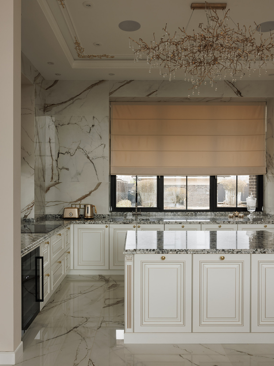 Остров в этой кухне — центр композиции. В данном проекте мы сознательно отказались от дополнительного функционала: без мойки и варочной поверхности, только рабочая столешница. Такое решение позволило максимально расширить полезную плоскость, сделать остров удобным для повседневной работы и сервировки, а также существенно увеличить объём хранения. Он не перегружает пространство инженерией, оставаясь визуально лёгким и архитектурно выверенным. В результате остров работает как логичное продолжение кухни: функциональный, пропорциональный и собранный элемент, который объединяет пространство и подчёркивает статус всего интерьера.