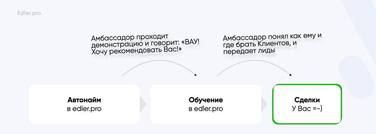 ? Очень просто: Автонайм - создает кандидатов, которые влюблены в Вашу компанию и хотят с Вами работать Автообучение - обучает кандидатов продукту, тонкостям работы в формате 1-2-3, онлайн Результат - в Вашей компании появляются сделки с помощью Амбассадоров. Пример: Публикуем вакансию "Амбассадор Бренда (Ваш бренд) Получает 1000 откликов 100 - человек прошли демо 30 - прошли обучение 10 - сделали результат 1-2% - норм статистика Результат - это 1 сделка в первый месяц ОТ КАЖДОГО Амбассадора. Ваш чек: 200 000 Р 10 сделок х 200 000 Р = 2 000 000 Р Цена вакансии на 1 000 откликов 7 500 Р. Потратили 7 500 Р, сделали 2 000 000 Р через рекомендации от Амбассадоров. На этом все? Нет. Амбассадоры продолжают свою работу, набирают темы из месяца в месяц. Просто? Да, когда у Вас есть опыт создания таких воронок. Если у Вас есть боль с лидами, подключайте сеть амбассадоров, и Вы сможете получать лиды, платить за сделки, и идти в масштаб супер быстро, используя очевидный, простой, и управ