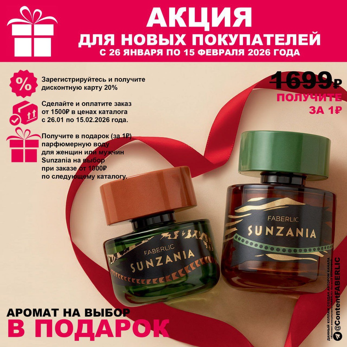 ⭐️⭐️⭐️⭐️⭐️ ⭐️⭐️⭐️⭐️⭐️⭐️⭐️ ⭐️Аромат в подарок! Всем, кто зарегистрируется в Faberlic с 26 января по 15 февраля 2026 года и совершит покупку в периоде №02/2026, дарим аромат на выбор при заказе по следующему каталогу с 16 февраля по 1 марта 2026 года. ⭐️Чтобы получить подарок: ⭐️До 15 февраля включительно сделайте и оплатите заказ на сумму от 1500 р.* (в ценах каталога). ⭐️ С 16 февраля по 1 марта 2026 года вместе с очередным заказом от 1000 руб. получите в подарок (за 1 р.) аромат на выбор. * Без учета доставки Аромат на выбор: Парфюмерная вода для женщин Sunzania (3106); Туалетная вода для мужчин Sunzania (3916). Подарок за регистрацию и первую покупку будет доступен при оформлении заказа в разделе «Персональные акции — Стартовая программа». Наполните корзину до нужной пороговой суммы, которая указана в правилах акции, и добавьте подарок в заказ. * Без учета доставки