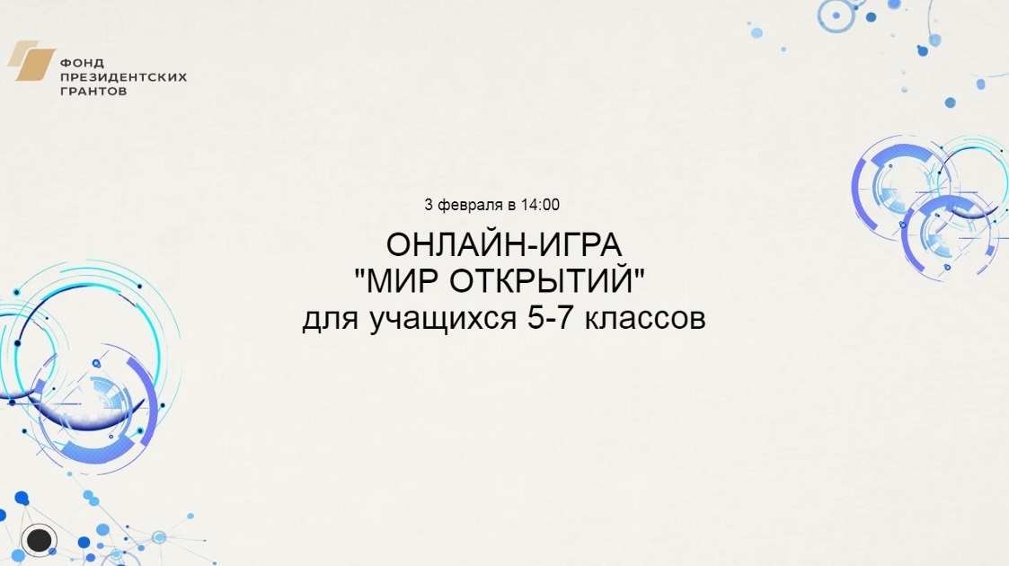 Дата и время проведения: 03 февраля 2026 года в 14:00. Задачи игры: Развитие надпредметных навыков; • Повышение мотивации учащихся к дальнейшей интеллектуальной работе; • Развитие командного взаимодействия, стимулирование общения между школьниками разных возрастов; • Формирование развивающей образовательной онлайн-среды; • Активизация команд учащихся, создание интеллектуального актива школы; • Формирование позитивного отношения к познавательной, интеллектуальной деятельности. Организаторы: Образовательный кластер Калужской области, Общероссийская общественная Малая академия наук «Интеллект будущего», Некоммерческое партнёрство Центр развития образования, науки и культуры «Обнинский полис». Для участия в игре НЕОБХОДИМО ПОДАТЬ ЗАЯВКУ до 29 января 2026 г. Заявку можно оформить через онлайн-кабинет. Для этого зайдите по ссылке new.future4you.ru/catalog/tu..., найдите карточку игры «Мир открытий» или «Мир науки и техники» и нажмите кнопку «В корзину». Перейдите в корзину и нажмите «Офор