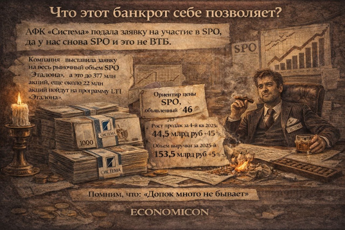 ? АФК «Система» подала заявку на участие в SPO, да у нас снова SPO и это не ВТБ. Компания выставила заявку на весь рыночный объем SPO «Эталона», а это до 377 млн акций, еще около 22 млн акций пойдут на программу LTI “Эталона”. Ориентир цены SPO, объявленный “Эталоном”, — 46 руб. за акцию. Более того, «Эталон» сегодня отчитался за 4-й квартал и за 2025 год. За 4й квартал 2025 года рост продаж до 200,5 тыс. кв. м (+27% г/г) и 44,5 млрд рублей (+45% г/г). За 2025-й год компания реализовала 671 тыс. кв. м недвижимости (-4% г/г) общей стоимостью 153,5 млрд руб (+5% г/г), на 14% превысив опубликованный Группой прогноз. Продажи в премиальном сегменте увеличились на 87%, проекты в Москве и Санкт-Петербурге составили 79% продаж в натуральном выражении и 85% продаж в денежном выражении, средняя цена квадратного метра выросла на 9% до 229 тыс. рублей, средняя цена квадратного метра жилой недвижимости выросла на 19% до 332 тыс. рублей ——— Помним, что: “Допок много не бывает”