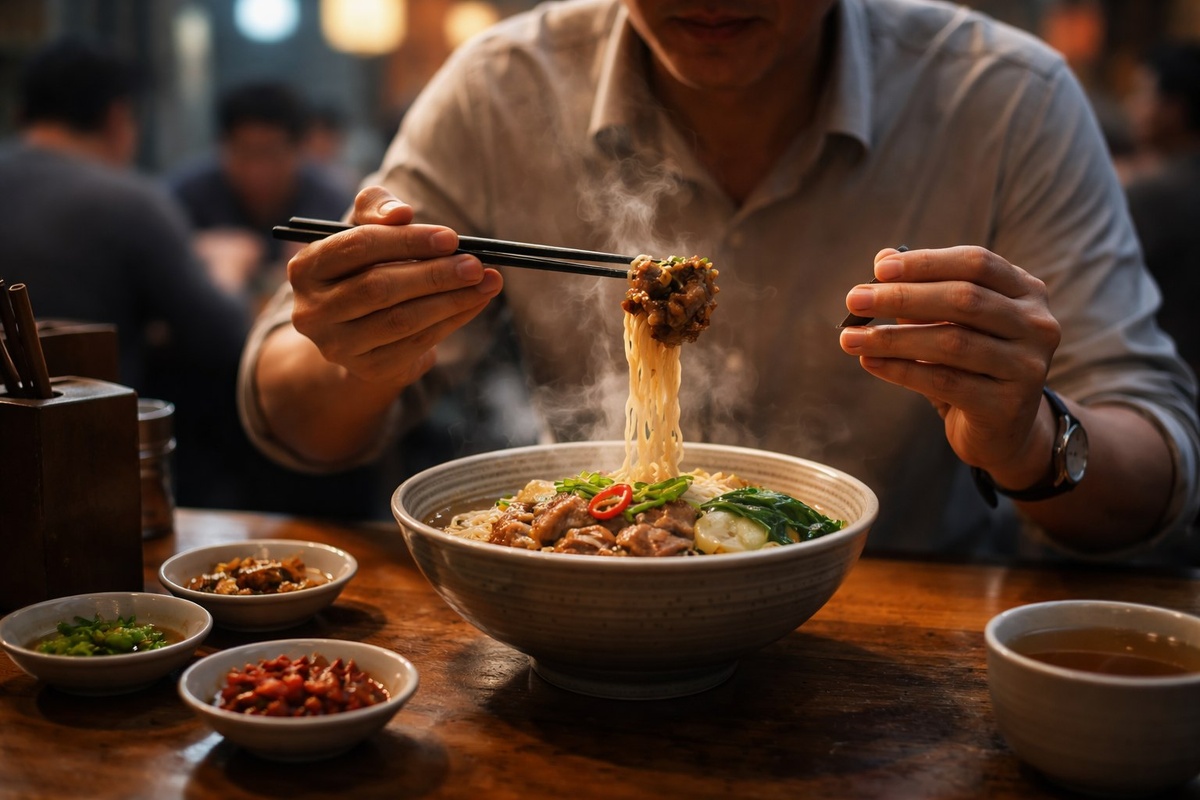 Этот материал с сайта Чжунго 24. В Китае есть один бытовой жест, который не встретишь в учебниках этикета, но который говорит гораздо больше, чем слова. Его можно наблюдать в простых лапшичных, где за столиками сидят уставшие после работы люди. В тот момент, когда перед человеком ставят большую пиалу с дымящейся лапшой, он часто совершает небольшой, почти ритуальный танец своими палочками. Он не сразу начинает есть. Сначала он поднимает палочки над миской, как дирижер перед оркестром, и совершает ими несколько легких круговых движений по воздуху. Он может слегка разворошить лапшу, чтобы оценить количество мяса и овощей, или аккуратно подцепить особенно ароматный кусочек и ненадолго задержать его над паром, словно вдыхая его запах. Это не проверка качества, это первичный ритуал наслаждения. В этом простом движении заключен целый кодекс. Во-первых, это сигнал повару или хозяйке заведения, наблюдающей иногда из-за стойки: «Я увидел, я оценил, все в порядке». Это жест благодарности еще до