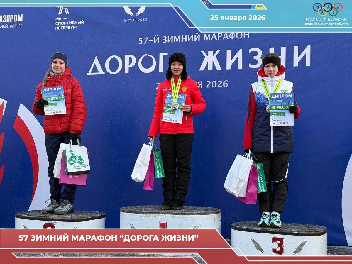 " 🏁25 января тысячи спортсменов и любителей бега вышли на старт марафона "Дорога жизни", посвященного 82 годовщине полного освобождения Ленинграда от фашистской блокады. Каждый год марафон собирает всё больше участников, желающих почтить память и показать силу духа на 4 дистанциях: 42,2 км, 10 км, 5 км и 1 км. 🏃♂Начало этому событию 21 января 1970 года дал советский сверхмарафонец и житель блокадного Ленинграда Григорий Иванович Колгашкин. Вместе с единомышленниками в свой день рождения он вышел на первый забег по маршруту Дороги жизни. Это дало начало важной традиции, которая сохраняется до сих пор. Наша спортсменка ✨Калакутина Юлия приняла участие в памятном забеге на дистанции 5 км и заняла 🥉третье место (22:44) среди девушек до 17 лет. 👏Поздравляем Юлию и тренера Тюрина Игоря Александровича с медалью традиционного зимнего марафона и желаем дальнейших успехов! #легкаяатлетика #МыСпортивныйПетербург #ГБУДОСШОРПушкинскогорайонаСанктПетербурга