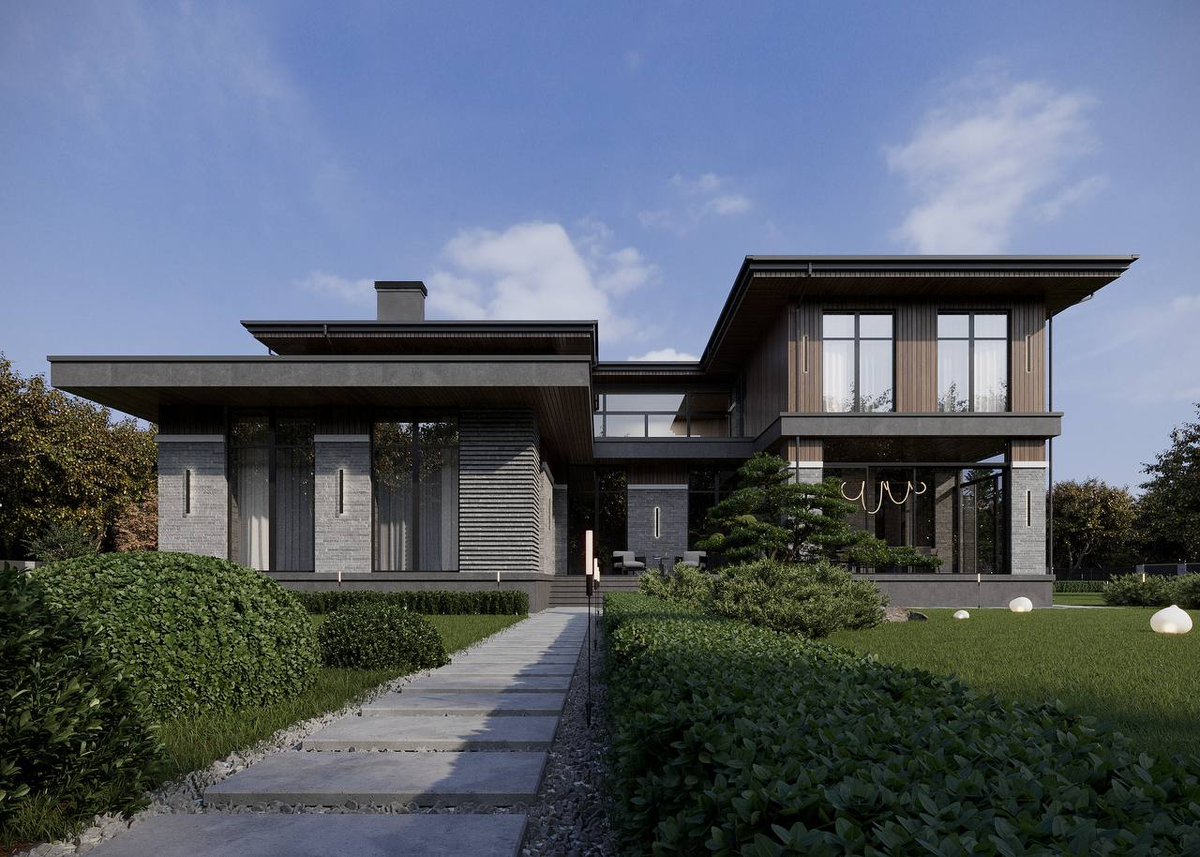 дом площадью 976 м² спроектирован так, чтобы пространство было выстроено последовательно и без перегрузки. Дом трёхуровневый. Технический этаж полностью отдан хозяйственным функциям: здесь размещены погреб, морозильная, прачечная, винная и другие помещения — всё, что должно быть под рукой, но не участвовать в повседневной жизни дома. Первый этаж посвящён времяпровождению с семьёй, друзьями или близкими. Гостевая спальня с отдельным санузлом и гардеробной расположена обособленно. Рядом — бильярдная и тренажёрный зал с душевой, объединённые в самостоятельный блок отдыха. Из кухни-гостиной есть выходы на две террасы: закрытую, рассчитанную на круглогодичное использование, и открытую — для тёплых сезонов. Второй этаж — приватная зона. Здесь находятся мастер-блок, рабочий кабинет и дополнительные жилые комнаты. Два балкона расширяют сценарии использования пространства и добавляют визуальной лёгкости дому снаружи. На участке предусмотрены отдельностоящие здания гаража и хозяйственного блока