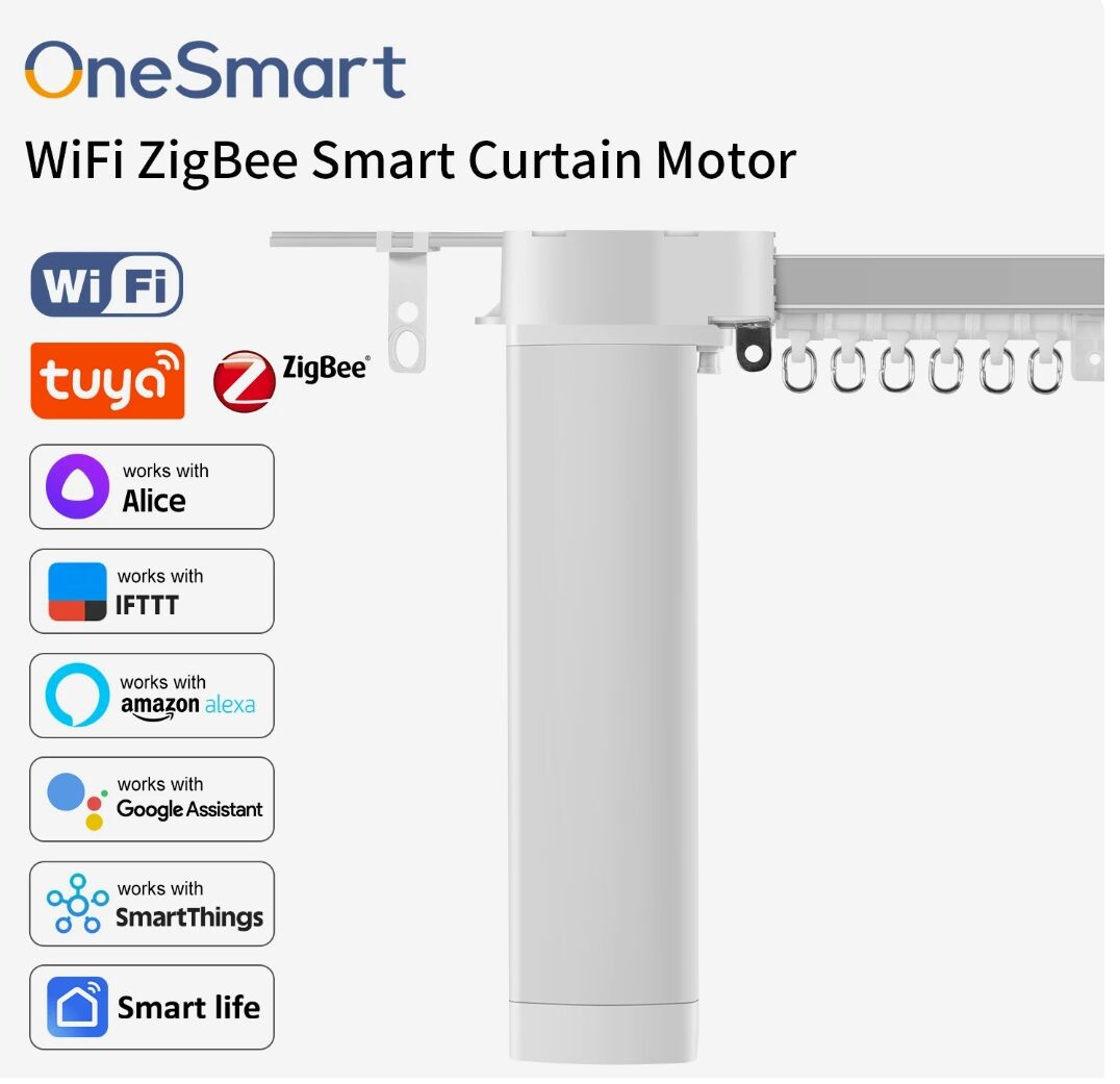 Привод OneSmart Tuya Smart Life 3-го поколения Ультра короткий -225 мм Подключение Wi-Fi, Zigbee . Дополнительный пульт 433 мГц. В комплекте поставки Электрические умные шторы : Привод двигателя, Рельсовая система Поддержка Google Assistant ,Alexa, Яндекс Алиса ,SmartThings, IFTTT Размер двигателя штор: прибл.225*50*70 мм