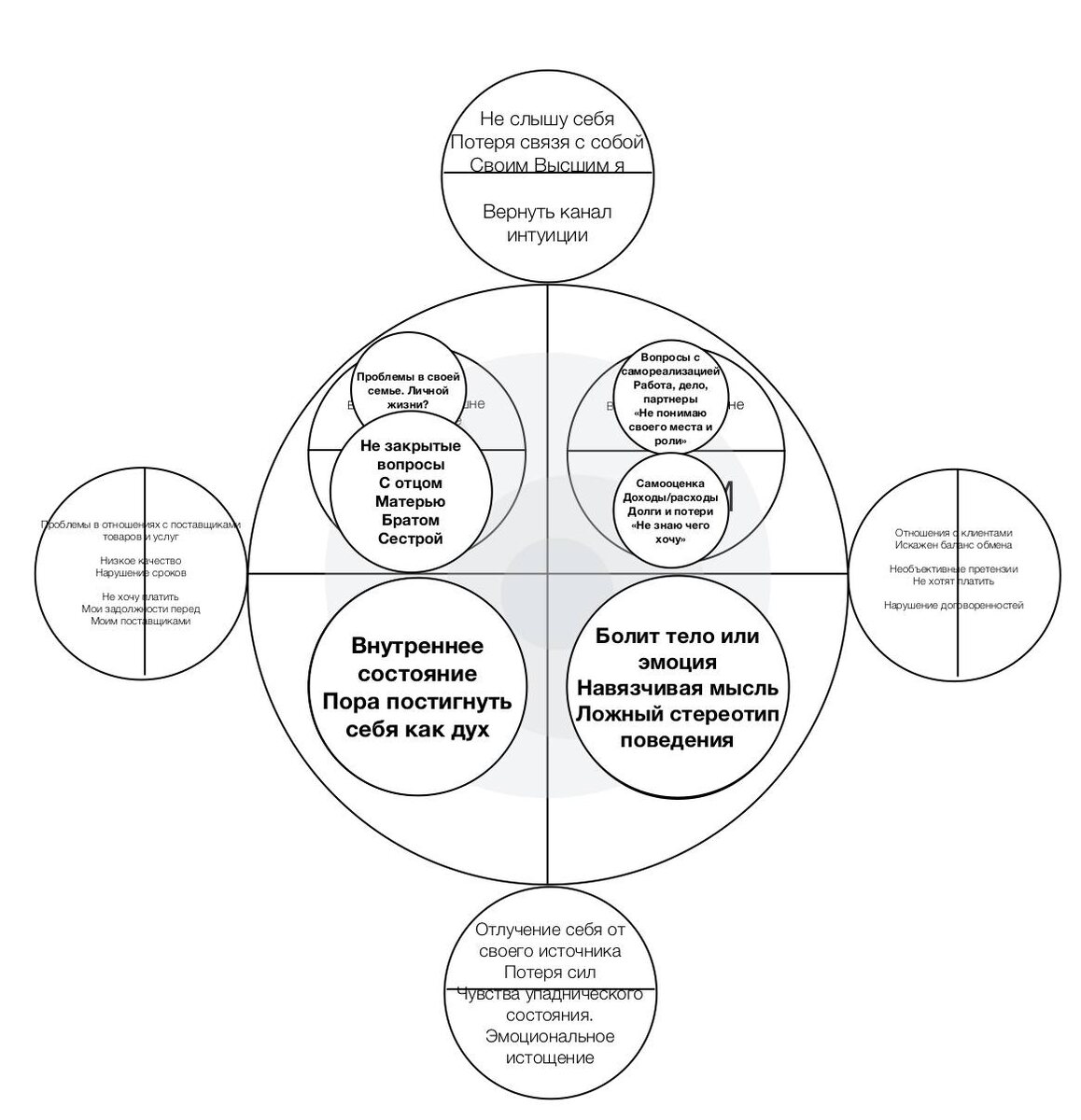 Свое текущее состояние и положение духа. Где сейчас проблемы, там требуется внимание. Там требуется исцеление. Там есть еще не пройденные уроки жизни. 4 внешних связи 4 внутренних аспекта