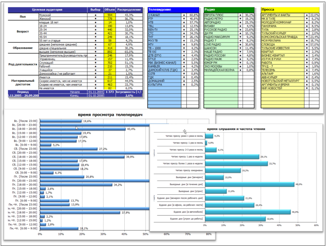 В результате, только за несколько месяцев мы собрали банк данных о медиа-предпочтениях более чем 2500 респондентов в разрезе ТВ, радио и печатных СМИ, а также в разрезе печатных рубрик, тематики передач и времени их просмотра или слушания.