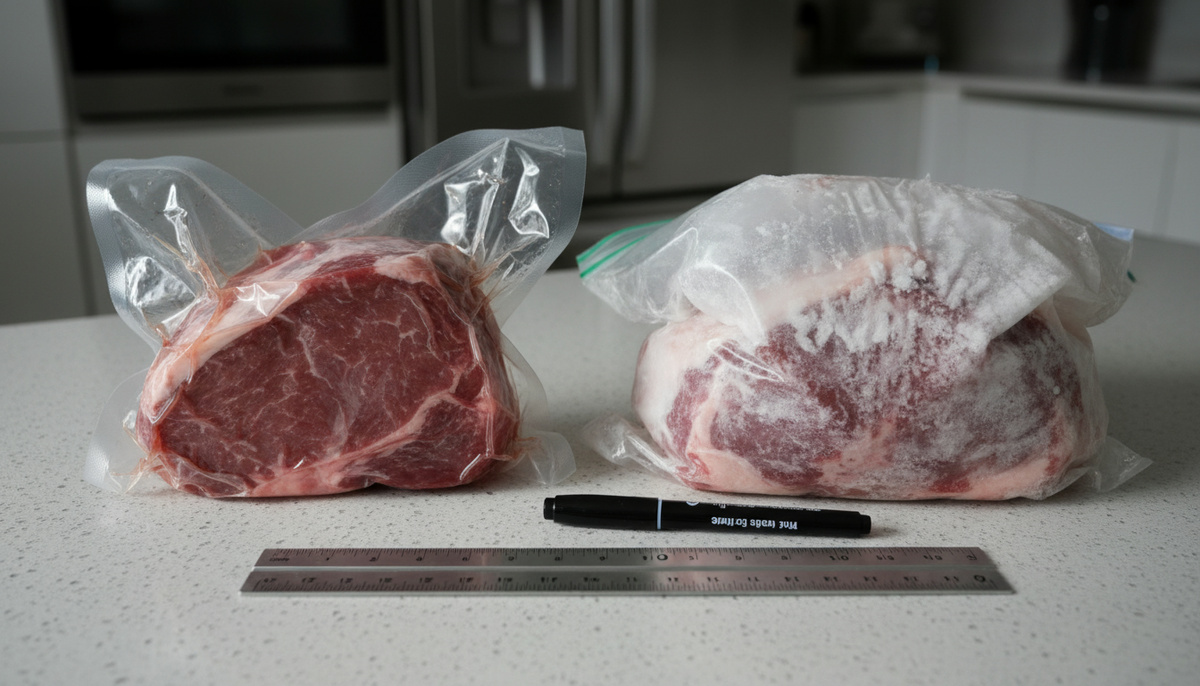 Вопрос для комментариев: у вас мясо чаще становится «сухарём» из-за воздуха в упаковке (иней, пузырь) или из-за порядка (лежит долго, без даты, забывается)? И какая морозилка — ящик в холодильнике или отдельный ларь?