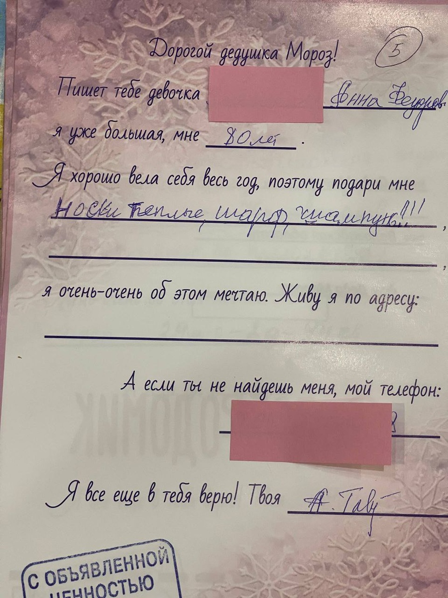 Бабушка Анна написала письмо, в котором указала свои пожелания: тёплые носочки, шарфик и шампунь. И вот, после каникул и морозов, мы всё‑таки вручили долгожданный подарок! Бабушка Анна очень благодарна. А когда улыбаются бабушки, на душе становится так хорошо… Хочу поблагодарить Татьяну за помощь в подготовке подарка — вместе мы осуществили маленькую мечту для старшего поколения. Были и другие письма с пожеланиями: * «Хочу кастрюлю»; * «Хочу ангелочка или балерину — с самого детства». Но самое трогательное письмо было от бабушки, которая никогда не была в салоне красоты. Она мечтала, чтобы ей сделали причёску и маникюр. И это желание мы тоже исполнили! Делайте добро — и оно к вам вернётся.