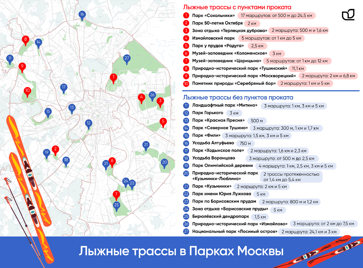 Во многих парках работают пункты проката лыжного инвентаря, где можно арендовать всё необходимое. Подробности по каждому парку собрали ниже.