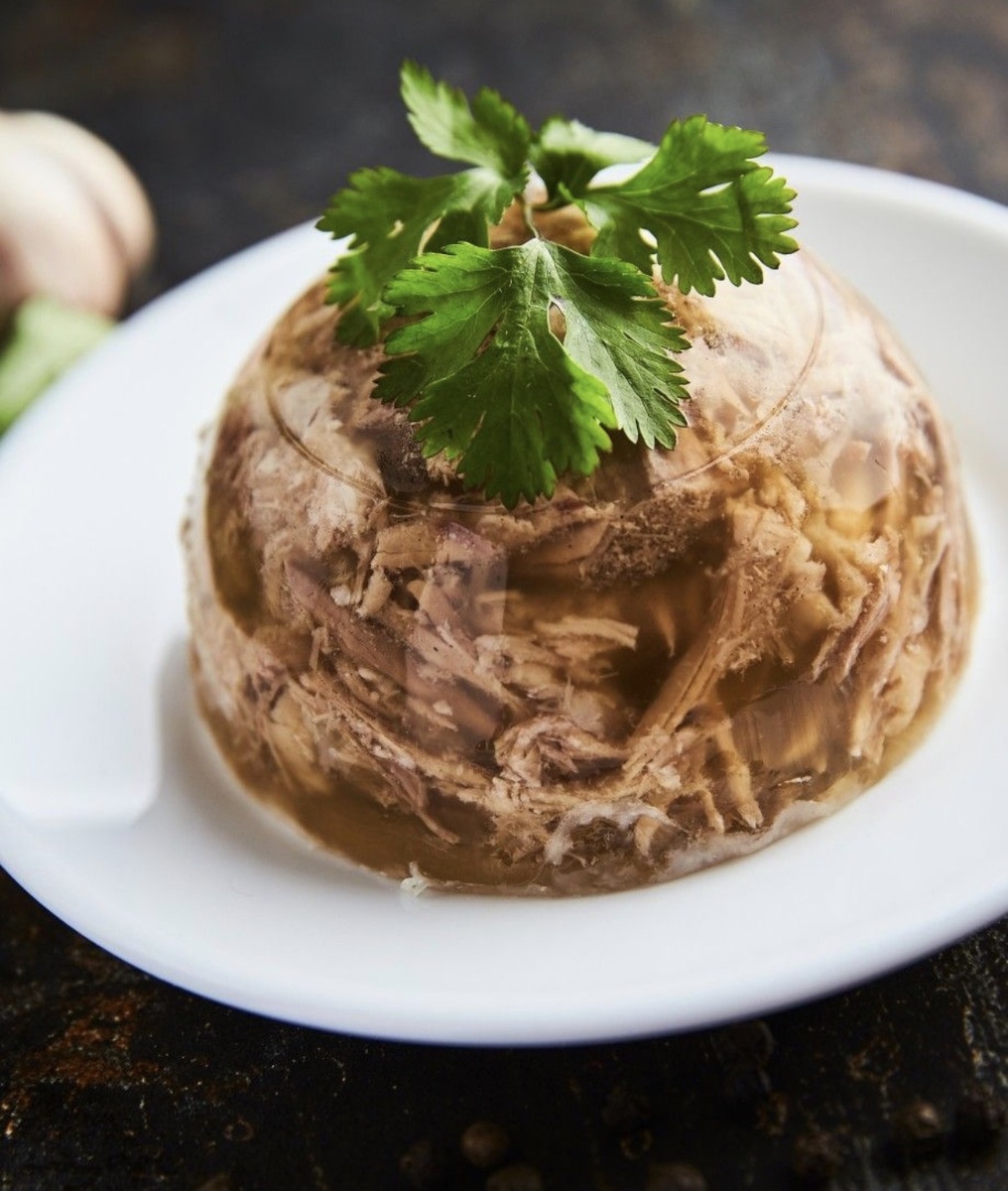 Часто эти блюда путают, хотя между ними есть различия: Холодец возник как способ сохранить мясной бульон на холоде: люди заметили, что на морозе он застывает. В русской кухне он оформился как самостоятельное блюдо, а во Франции рецепт сделали более изысканным, добавив коренья и специи. В среднем на 100 г: Например: холодец из курицы без кожи и со снятым жировым слоем — около 110 ккал, холодец из свинины или говядины с кожей и костями — 150 ккал и выше. Холодец — белковое блюдо, приготовленное из мяса и соединительной ткани (костей, хрящей, кожи), которые при длительной варке отдают в бульон белки, в том числе коллаген в форме желатина. В составе холодца присутствуют: аминокислоты (глицин, лизин), витамины группы B, минералы: железо, магний, калий, фосфор. Калорийность и состав зависят от вида мяса и количества жира. Домашний и промышленный холодец могут существенно отличаться по пищевой ценности. Традиционно холодец едят с хреном, горчицей. С точки зрения калорийности эти добавки не и