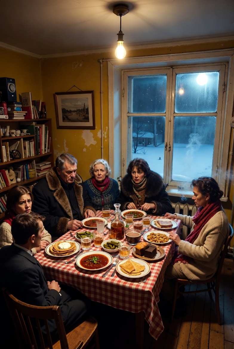 В старой хрущевке на окраине Москвы, где зимой ветер завывает в щелях окон, а батареи еле теплятся, семья Смирновых собралась на воскресный ужин. Январь 2025-го выдался морозным, снег валил хлопьями, засыпая серые панельки и машины во дворе. Анна Петровна, седая женщина за шестьдесят, суетилась на крохотной кухне: разогревала борщ в кастрюле, жарила картошку с луком и грибами из банки, а на десерт достала пирог с яблоками из "Пятерочки". Запах еды смешивался с ароматом чая из электрического самовара – семейной реликвии с советских времен. Сергей Иванович, отец, пенсионер после закрытия завода, сидел во главе стола, уткнувшись в старый "Самсунг", бормоча: "Опять рубль падает, цены на коммуналку растут. Как жить-то?"