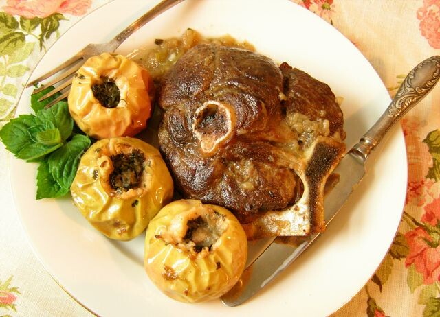 - Перед подачей нарежьте лопатку на порционные куски и украсьте тарелку карамелизированными яблоками.