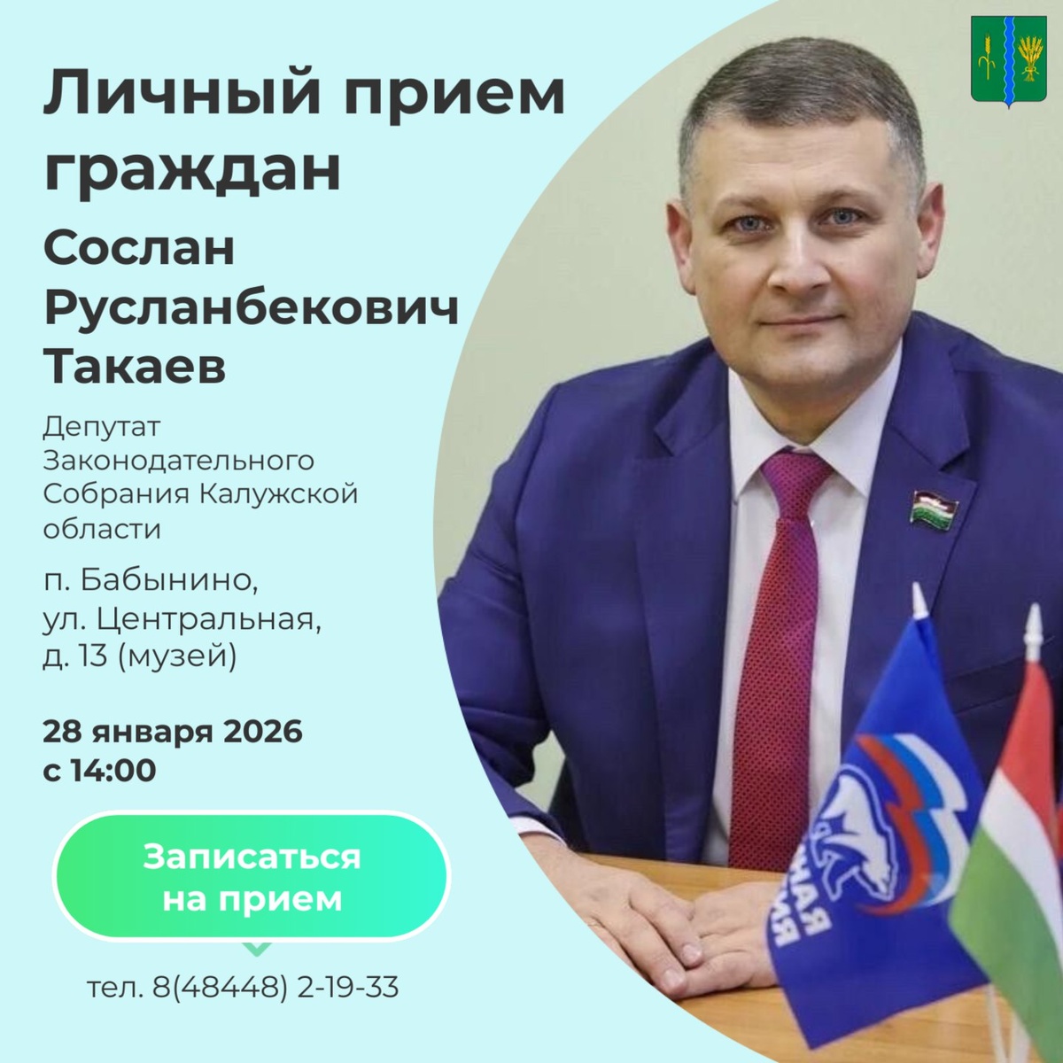! 28 ΡΠ½Π²Π°ΡΡ 2026 Π³ΠΎΠ΄Π° Π² 14:00 ΡΠΎΡΡΠΎΠΈΡΡΡ Π»ΠΈΡΠ½ΡΠΉ ΠΏΡΠΈΠ΅ΠΌ Π³ΡΠ°ΠΆΠ΄Π°Π½ Π΄Π΅ΠΏΡΡΠ°ΡΠΎΠΌ ΠΠ°ΠΊΠΎΠ½ΠΎΠ΄Π°ΡΠ΅Π»ΡΠ½ΠΎΠ³ΠΎ Π‘ΠΎΠ±ΡΠ°Π½ΠΈΡ ΠΠ°Π»ΡΠΆΡΠΊΠΎΠΉ ΠΎΠ±Π»Π°ΡΡΠΈ Π‘ΠΎΡΠ»Π°Π½ΠΎΠΌ Π’Π°ΠΊΠ°Π΅Π²ΡΠΌ. π ΠΠ΅ΡΡΠΎ ΠΏΡΠΎΠ²Π΅Π΄Π΅Π½ΠΈΡ: ΠΏ. ΠΠ°Π±ΡΠ½ΠΈΠ½ΠΎ, ΡΠ». Π¦Π΅Π½ΡΡΠ°Π»ΡΠ½Π°Ρ, Π΄. 13 (ΠΌΡΠ·Π΅ΠΉ) π·πΊ ΠΠ±ΡΠ΅ΡΡΠ²Π΅Π½Π½Π°Ρ ΠΏΡΠΈΠ΅ΠΌΠ½Π°Ρ ΠΠ°ΡΡΠΈΠΈ Β«ΠΠ΄ΠΈΠ½Π°Ρ Π ΠΎΡΡΠΈΡΒ» ΠΠ°Π±ΡΠ½ΠΈΠ½ΡΠΊΠΎΠ³ΠΎ ΠΎΠΊΡΡΠ³Π°. ΠΡΠ΅Π΄Π²Π°ΡΠΈΡΠ΅Π»ΡΠ½Π°Ρ Π·Π°ΠΏΠΈΡΡ ΠΏΠΎ ΡΠ΅Π»Π΅ΡΠΎΠ½Ρ: 8(48448)21933. ΠΠ΅ ΡΠΏΡΡΡΠΈΡΠ΅ Π²ΠΎΠ·ΠΌΠΎΠΆΠ½ΠΎΡΡΡ Π·Π°Π΄Π°ΡΡ ΡΠ²ΠΎΠΈ Π²ΠΎΠΏΡΠΎΡΡ ΠΈ ΠΎΠ±ΡΡΠ΄ΠΈΡΡ Π²Π°ΠΆΠ½ΡΠ΅ ΡΠ΅ΠΌΡ!