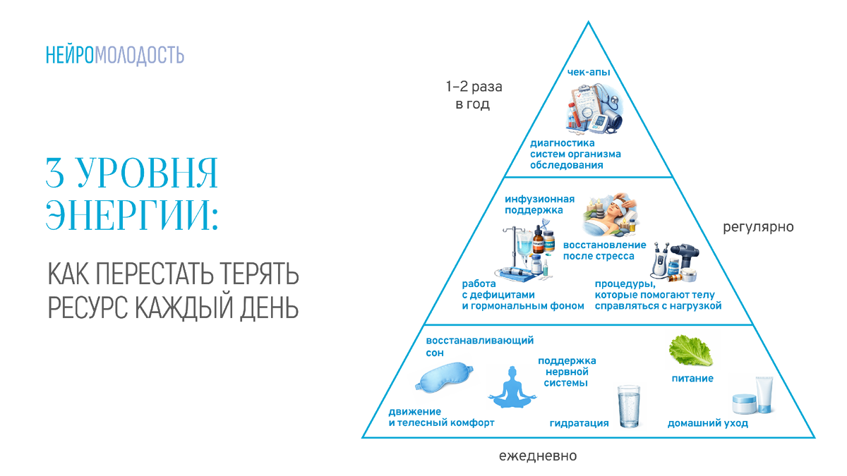 Есть люди, которые и в 40, и в 50, и даже в 60+ выглядят и чувствуют себя собранными, энергичными и полными сил. Другие же даже в 25-30 лет буквально доживают до вечера на силе воли и ударной дозе кофе. Так в чем разница? Генетика? Мотивация? ЗОЖ? Уровень энергии и настроение — это не случайность, а результат того, как организм живёт каждый день и как он восстанавливается после нагрузок. Мы в клинике часто видим, как человек много делает для себя — занимается спортом, следит за питанием, ходит на процедуры, но результат нестабильный. Периоды подъёма сменяются откатами, силы то есть, то нет. Когда уровень нагрузки высок и длится годами, нервная и гормональная системы работают без пауз, а тело тратит ресурс быстрее, чем успевает его восполнять, ещё одна тренировка или ещё один БАД просто не справляются. Энергия и здоровье не складываются из отдельных действий, они держатся на понятной систему и без неё организм не может удержать результат. Давайте представим это как пирамиду с 3-мя уров