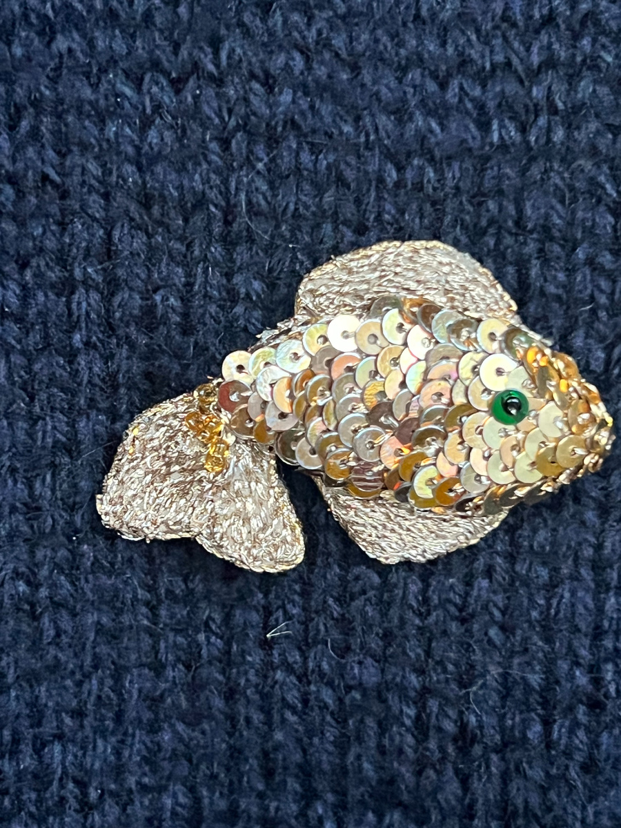 КАК Я ЕЕ ВЫШИВАЛА. Материалы, фетр для основы рыбки, любой тянущийся материал, для формирования толстой тушки, наполнитель тушки - у меня шерсть для валяния. Нитки золотые -Индия, для вышивки, металлические, золотые пайетки. Нарисовала я рыбку, сделала выкройку. На фото две выкройки одна целая, другая "расчлененка". Так мне удобней подкраивать, вырезать детали. Пяльцы, в них заправлена старая шторка, пришита плоская, фетровая рыбка и на фетр я пришила тянущийся кусочек ткани. НЕ до конца пришила, буду набивать тушку шерстью. Плотно набила, толстенькая рыбка получилась. Плавники и хвост из фетра. Далее я хотела вышить рыбку золотой ниткой. Я это даже сделала, но одно , два неосторожных движений и вышивка у меня поехала. Не получилось. Хотя так тоже возможно, аккуратность просто нужна. Я решила вышить металическими пайетками. Не обязательно метал использовать, можно взять любые другие пайетки, просто мне они нравятся. Плавники и хвост вышивала тамбурным швом, нить в 4 сложения. На фото
